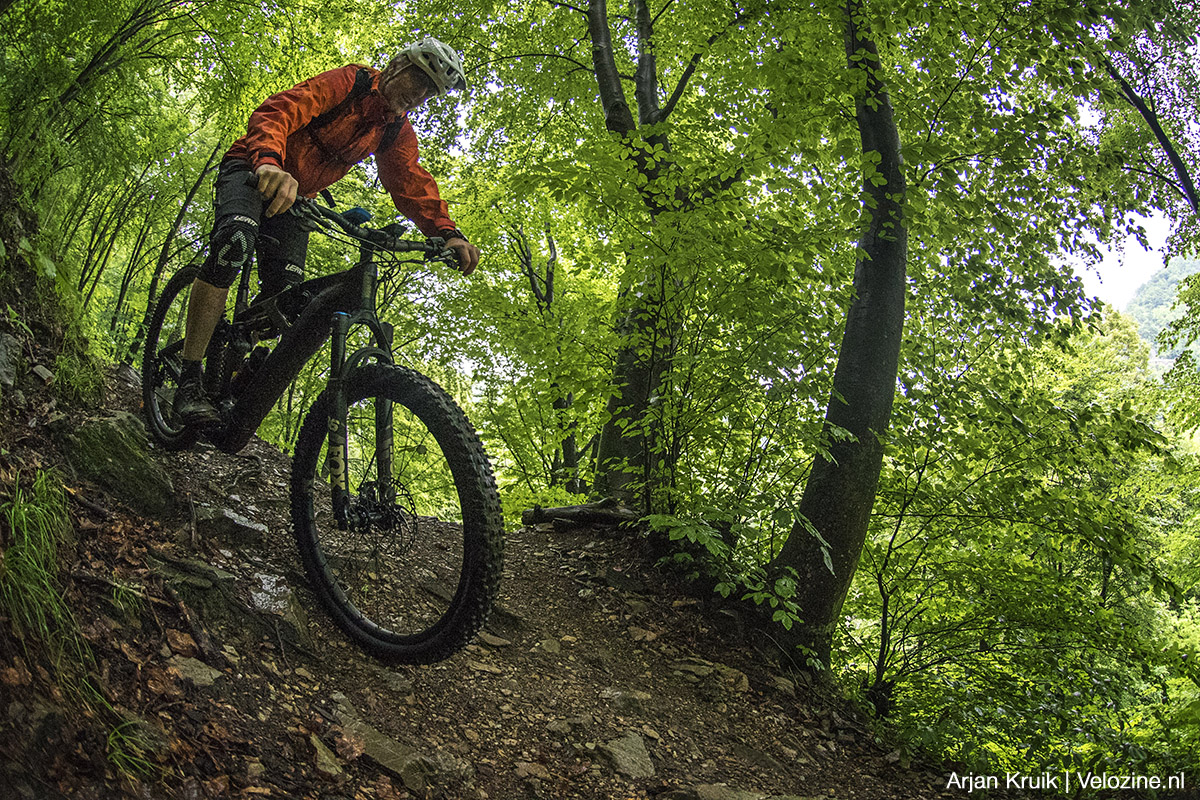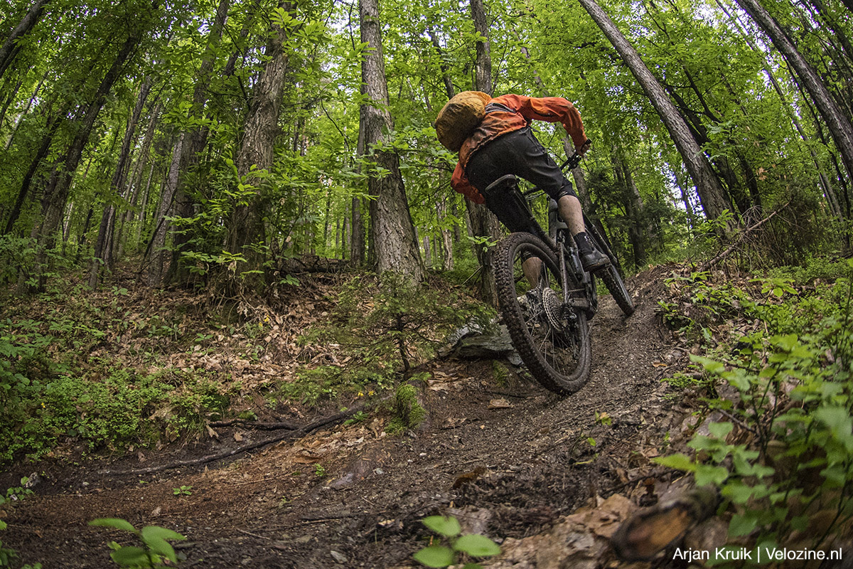 Twee zaken vielen me verder nog op in vergelijking tot de ritten met de e-mountainbike. Allereerst kan op een spierfiets de bandenspanning omlaag. Logisch, de massa die de banden ondersteunen is immers veel lager. Daarnaast lijkt de souplesse van het karkas minder. Wat ook logisch is, wederom vanwege het lagere gewicht van de fiets. Toch meld ik het even, want het doorslaan van de band komt op een lichtere, motorloze trailbike minder voor, ondanks de geringere luchtdruk in de band. Of anders gezegd: op een motorloze trailbike, met mijn gewicht (plusminus 75 kilo) en mijn rijstijl, kom ik aan het lichtere karkas van WTB niks tekort.