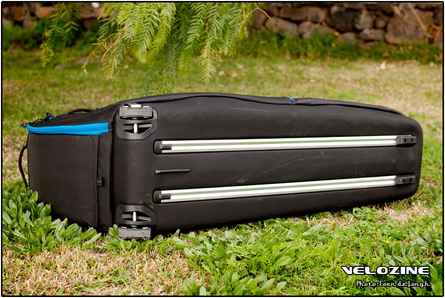 Waar de EVOC wat stugger aanvoelt, is de Thule wat flexibeler / zachter qua materiaal. Hij voelt ook net even iets lichter aan (7,7 kg volgens de fabrikant versus 9 kg voor ‘het origineel’). Ondanks dat, is de bescherming ruim voldoende. De wielen van de Roundtrip Traveler zijn dezelfde als van de Thule rolkoffers en lopen vanwege de plus banden, uh… brede wielen op ongelijke ondergrond net even wat makkelijker.
