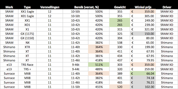 Zoals je uit bovenstaande specificaties opmerkt is menig 1x groepset ook niet bepaald goedkoop. Dit geldt niet enkel voor casette’s, waarbij prijs grofweg stijgt met bereik. Ook derailleurs zijn een stuk duurder geworden. Je betaalt toch echt meer voor minder, en dan hebben we het niet enkel over gewicht!