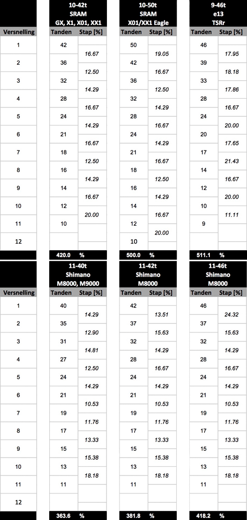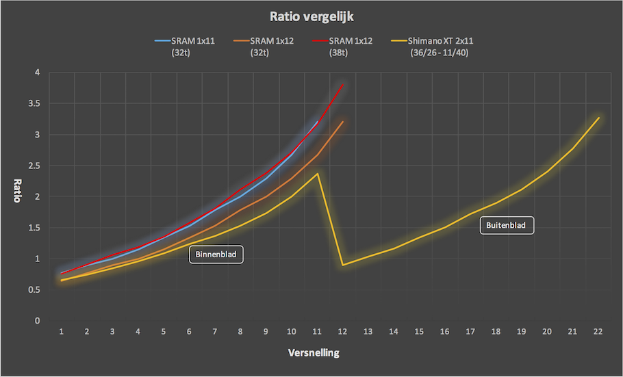 Met de komst van 11-speed cassettes zit je al aan grotere tussenstappen dan met een oudere 10-speed groep. De kleinste cassette die Shimano op XT niveau levert is nu immers 11-40t. Zoals uit het tabel hierboven blijkt zijn verschillen de stapgroottes tussen modellen met een paar procent. Zocht je vroeger al naar de kleinste spreiding op je cassette, dan ga je er met elke 1×11 of 1×12 aandrijving hoe dan ook nóg verder op achteruit. Koop dan lekker een 2×11 set.