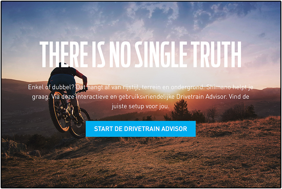 Ook ik heb maar even geklikt en de vragenlijst ingevuld. Twee keer zelfs voor mijn beide fietsen met ieder een ander inzetgebied. Het resultaat: beide malen 80% kans dat ik met een 1x aandrijving blij zou zijn. Hoewel 1x aandrijvingen redelijk normaal zijn geworden maakt de discussie – ‘Kan ik er nou wel of niet mee rijden?’ – nog steeds de gemoederen los. Goede zet, zo’n keuzehulpje…