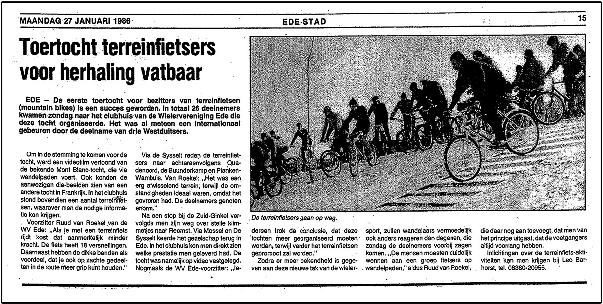 Eén van die fietsen werd gekocht door Ruud van Roekel. Hij was de toenmalige voorzitter van Wielervereniging Ede (WVE) waar de dikke-banden-fiets met scepsis werd ontvangen. Algemene consensus bij de fietsvereniging én de fietshandel: het zou een hype zijn die snel voorbij zou gaan. Het weerhield WVE echter niet om op 26 januari 1986 de eerste Terrein-fietstocht in Nederland te organiseren. Sporadisch waren er al wel wat cyclocross-toertochten in Nederland, maar een specifieke tocht voor die nieuwe hype, de terreinfiets, was er nog niet eerder.