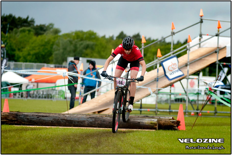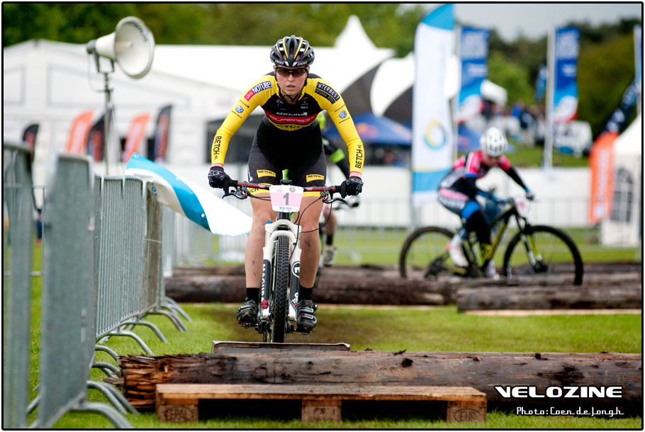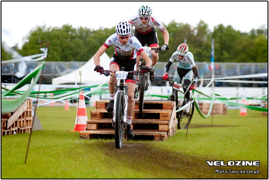 Het eerste officiële NK Sprint Eliminator, dat was het hoofdevenement op de zondag. Ook vermeldenswaardig: één dag eerder had het Merida-Bassa team zo’n beetje alle prijzen tijdens het NK Team relay binnen gesleept! Het concept van de XCE was simpel, maar doeltreffend: het grasveld naast de BMX arena was voorzien van diverse obstakels in de vorm van pallets, boomstammen, een brug, schansjes, en slingerde zich in een aantal lussen van start naar finish. Dit zorgde voor een overzichtelijk rondje, waarop je de wedstrijden vanuit een luie stoel op iedere willekeurige plek kon volgen. In tegenstelling tot eerdere XCE’s die ik meegemaakt heb, waarbij het altijd weer afwachten was wie er nu weer als eerste om een bocht kwam, vond ik deze opstelling erg goed! Ook technisch waren de boomstammen, sprongetjes en trapjes meer dan leuk. Ook dat is in het buitenland wel eens anders geweest. Een straatcriterium zonder enige moeilijkheid was niet ongebruikelijk. Enige kritische noot die gehoord werd, is dat het rondje dermate lang was, dat een goede sprinter of technisch rijder het uiteindelijk toch af zou leggen op inhoud. Leerpunt voor volgend jaar…