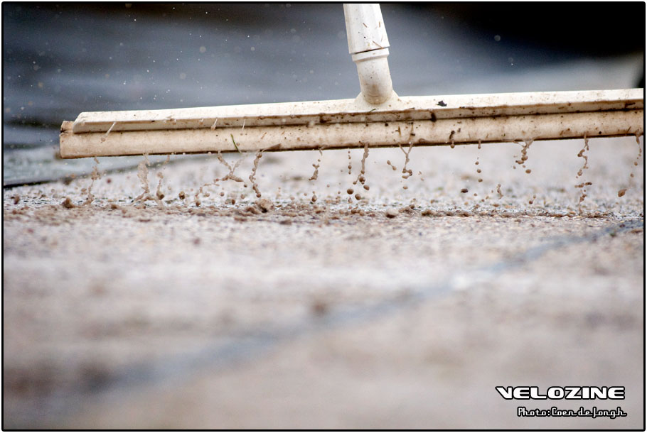 Tussen de heats moest de baan zo droog mogelijk gehouden worden.