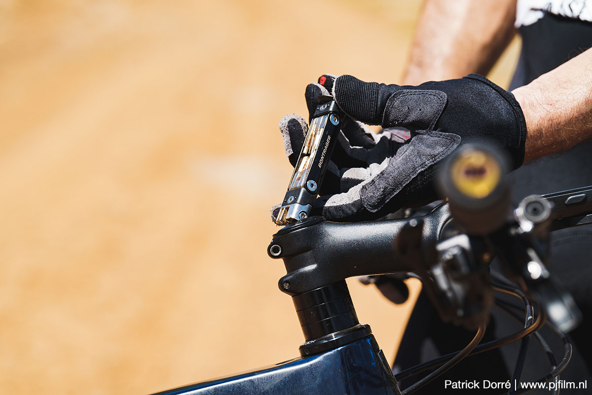 Hadden we al gezegd dat de Cape Epic zwaar is? Niet alleen fysiek en mentaal; óók het materiaal zal veel te lijden hebben. En een volgwagen met reserve-onderdelen zoals bij een wielerkoers…? Daarop wacht je tevergeefs bij de Cape Epic. Je móet dus zelfredzaam zijn. Maarten rijdt daarom met de in de vorkbuis gemonteerde Bontrager BITS multitool, die onze collega Lars iets meer dan een jaar geleden nog getest heeft. Die zit zodoende gemakkelijk binnen handbereik wanneer er onverhoopt gesleuteld moet worden.