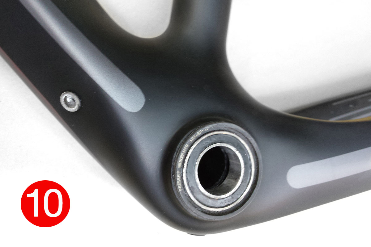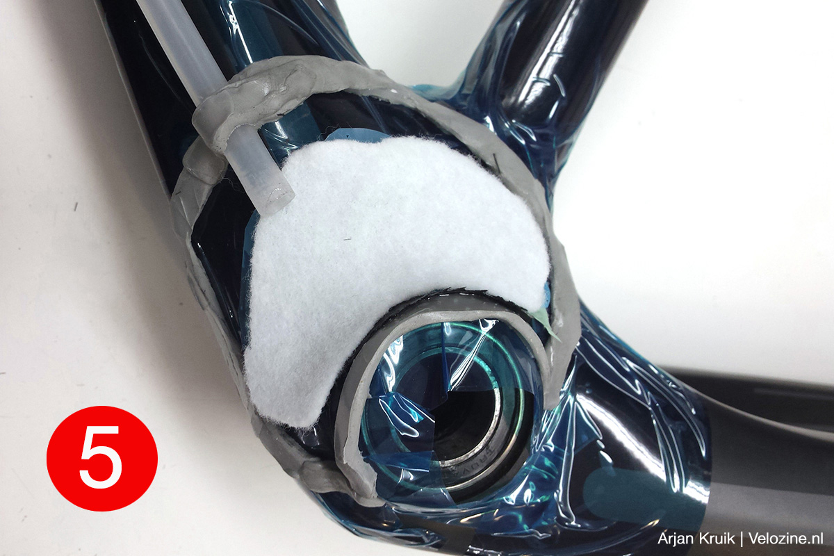 Ook de scheur boven de trapas van mijn ruim acht jaar oude Haibike Greed (foto 1) is volgens carbonspecialist Casper van Ee van Bikes4You in Emmen ontstaan in het productieproces. “Vermoedelijk is bij het lamineren lucht tussen de verschillende lagen blijven zitten, waardoor een zwakke plek is ontstaan. De scheur is daardoor ook niet door en door. Dit soort schade is prima en onzichtbaar te repareren,” aldus Casper. Op mijn vraag hoe ver je kunt gaan, meldt de carbon-expert dat de beperkte factor niet zozeer de ernst van de schade is, als wel tijd die het kost om een reparatie uit te voeren. “In principe is bijna alles te repareren, zelfs als je frame letterlijk in tweeën ligt.”