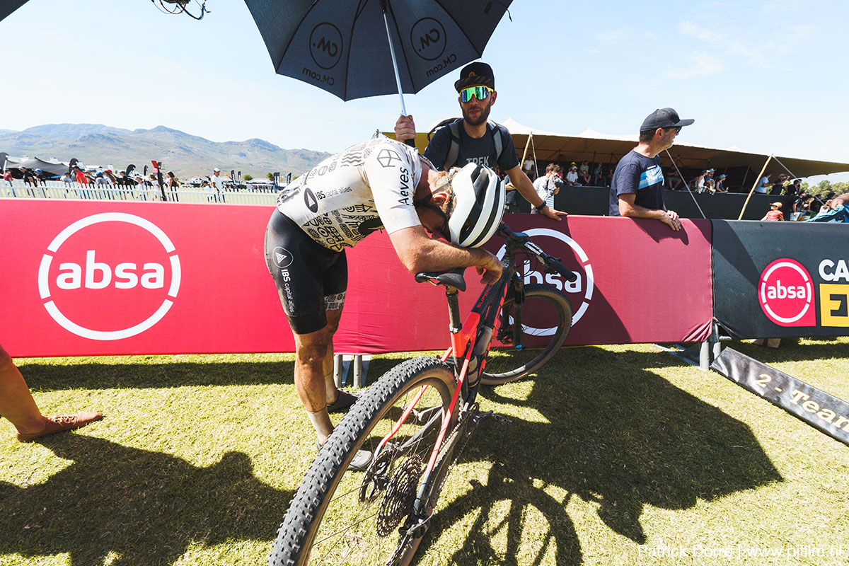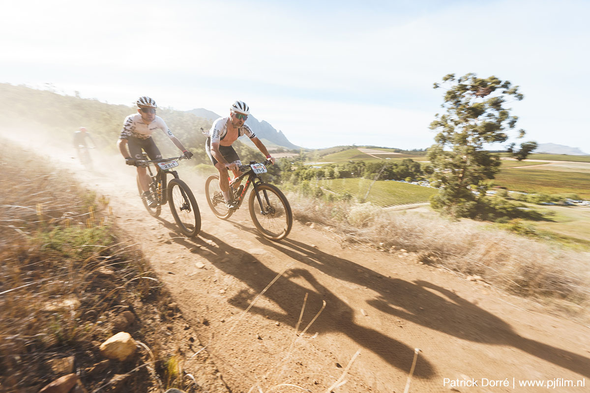 Ze verlaten Stellenbosch op weg naar het luxueuze wijn resort in Val de Vie. Onderweg worden ze bij deze zevende etappe getrakteerd op al het moois dat de omgeving te bieden heeft. Van wijngaarden tot nog meer vette single tracks. Het duurt langer dan gemiddeld voor ze worden gespot door het supportteam langs de kant, en dat is niet zonder reden. Als Maarten bij het tweede waterpunt probeert in te klikken in zijn pedaal, lukt dat niet.