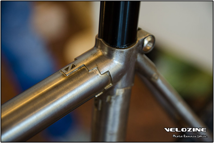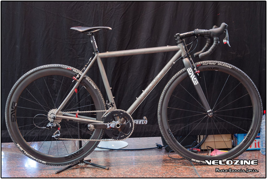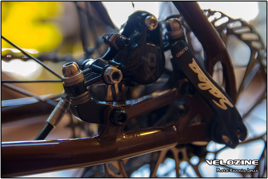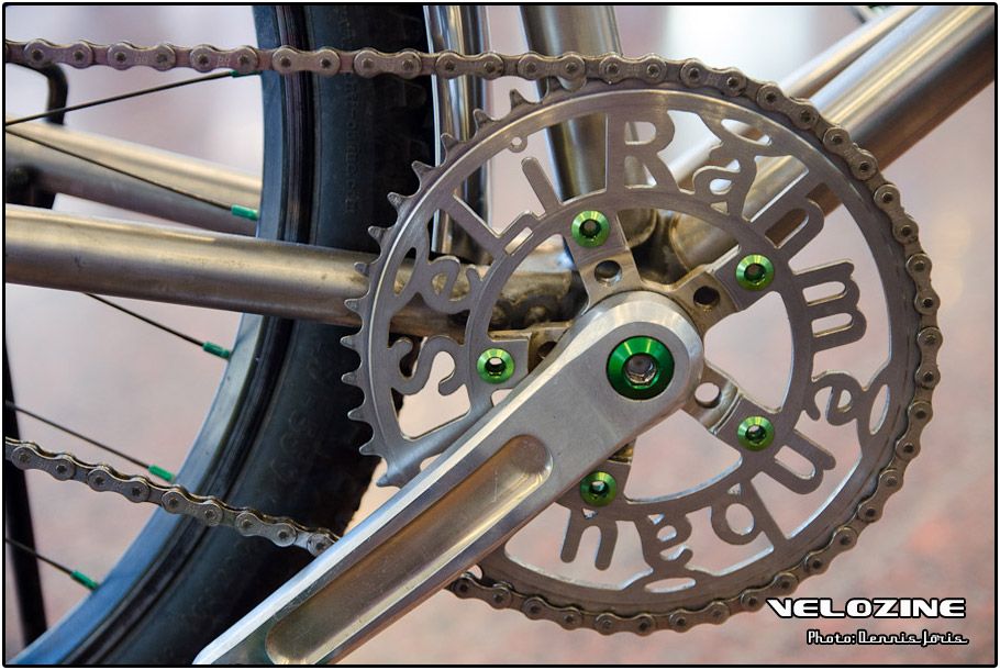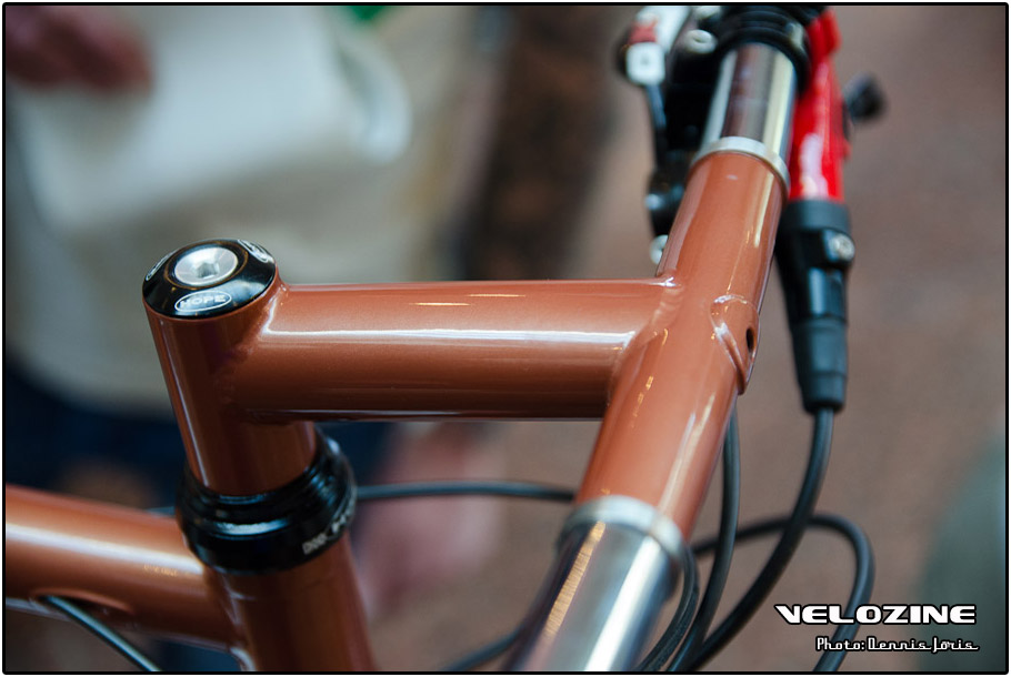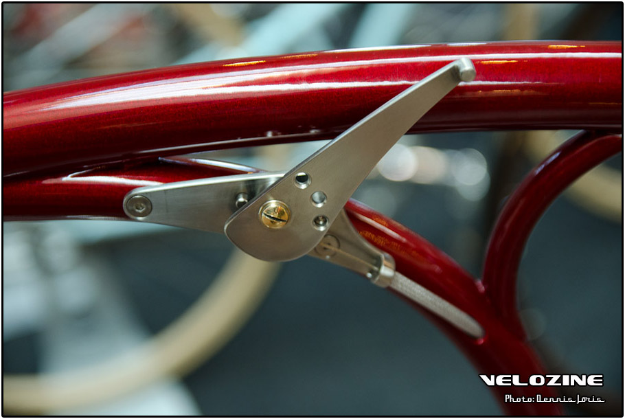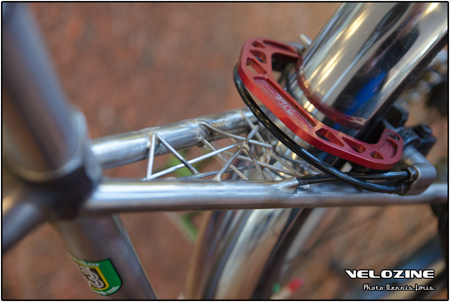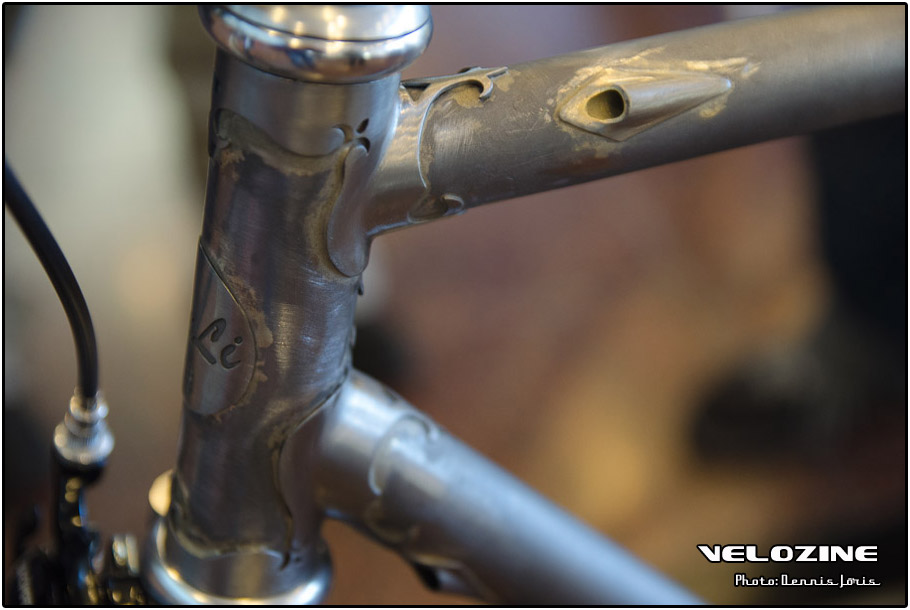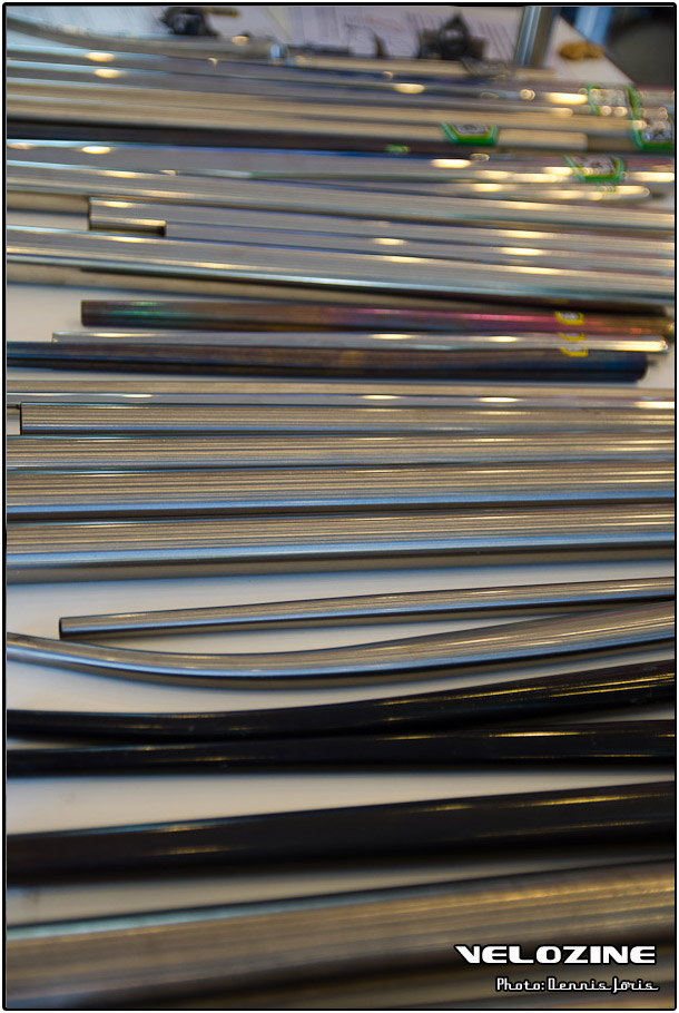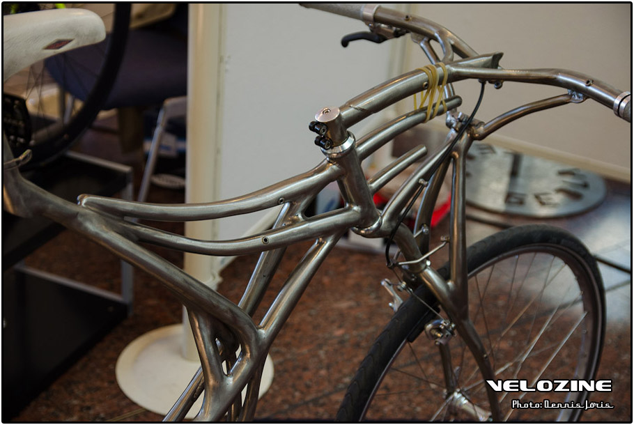 Uiteraard zijn er op dit soort shows, waar de ‘underground scene’ zich openbaart, trends te zien. Interne kabelgeleiding is er zo één. Sommigen gingen zeer ver om dit te bewerkstelligen, met wat ongelukkige knikken en ultra korte kabels tot gevolg… Een paar jaar geleden introduceerde buizenfabrikant Reynolds een roestvaststalen buizenset, de 953. Een goedkopere en vooral wat makkelijker te verwerken variant, de 931, heeft de deuren ook geopend voor amateur framebouwers, getuigen de enkele voorbeelden die we zagen. En waar staal ongeveer het meest gebruikte materiaal is voor menig amateur en professioneel custom framebouwer, lijkt hout het ‘buzzwoord’ momenteel. En onder die categorie, hoewel het natuurlijk geen hout is, noemen we ook bamboe. Beide vragen om geheel eigen productiemethoden en ontwerpen en wijken daarin nogal snel af van de traditionele framebouw. Zij die wel met ’traditionele’ materialen en dito methoden werken, moeten zich letterlijk in veel bochten wringen om met zeer bijzondere creaties te komen…