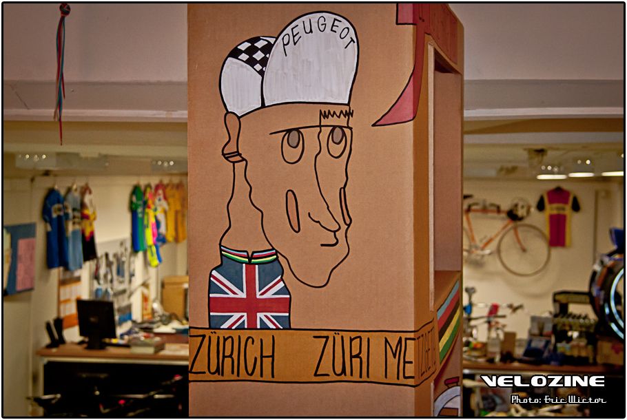 Daarom was Velozine op 29 november bij fietsenwinkel Cyclenation in Arnhem, voor een bezoek aan de expositie van het werk van Vincent van Eijk. Vincent, alias themannexttogod, maakt autobiografische kunst én “wielergerelateerde kunst”, in de vorm van stift-tekeningen op canvas, tekeningboeken, gedichten, en nog zo wat. Het werd een bijzondere avond…