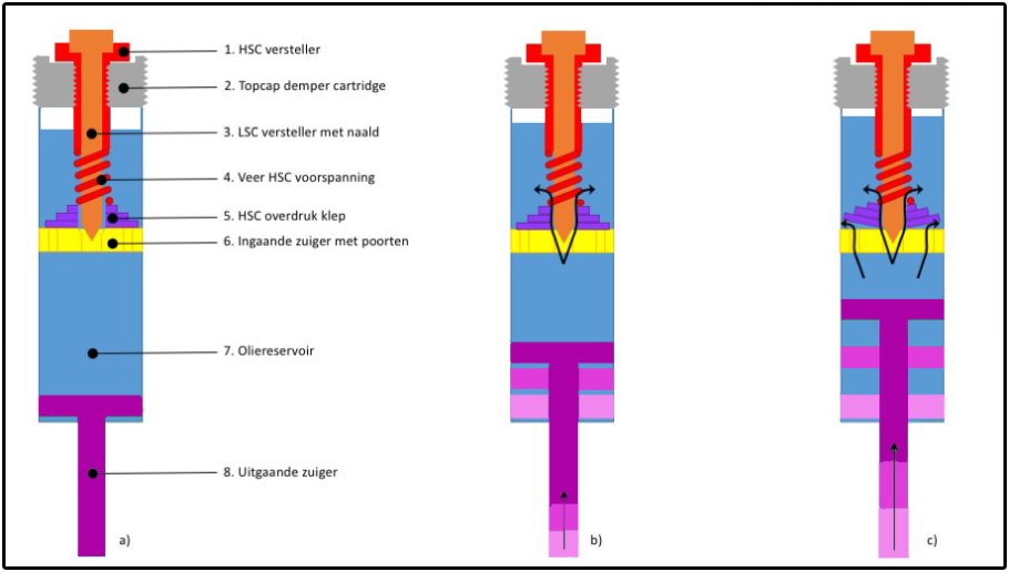 Versimpelde schematische weergave van de demper cartridge in een voorvork (a). In (b) en (c) zie je het verschil tussen langzaam inveren (olie wordt enkel door de centrale poort in de ingaande zuiger gedrukt) en snel inveren (olie wordt ook door het overdruk ventiel geforceerd).