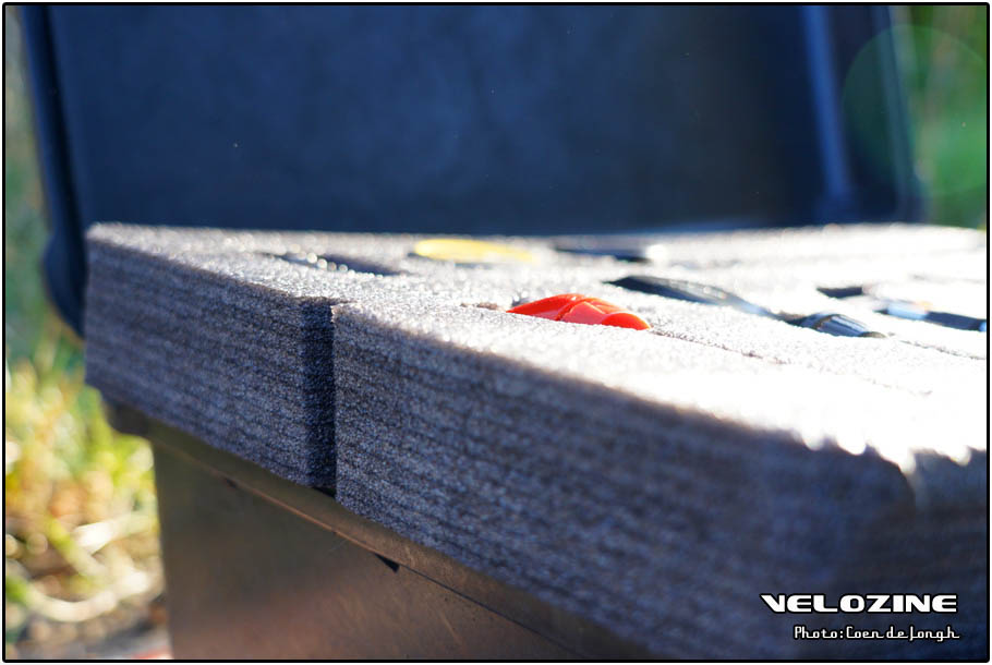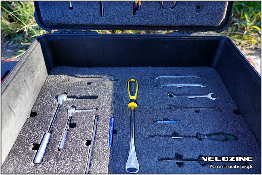 Eric heeft ervoor gekozen alles mee te nemen, inclusief een werkmatje en een schuimlaag tegen gerammel. Zijn Peli-case is verdeeld in 2x 57 mm en 1x 32 mm lagen, waarbij deel van de middelste laag – het meest obscure gereedschap voor het onderhouden van vorken en droppeppennen – thuisgelaten kan worden om ruimte te maken voor reservemateriaal.