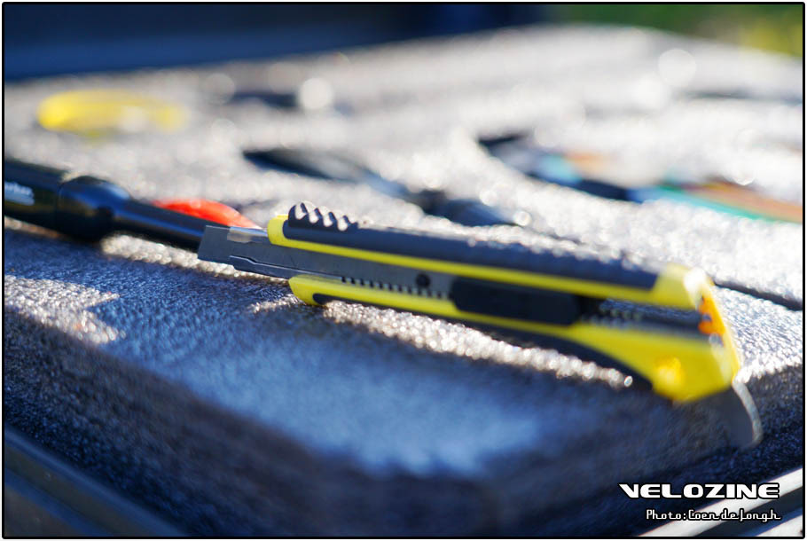 Collega Eric ging voor een complete oplossing, met alle fietsgereedschappen en ook ruimte voor bakjes reserve-onderdelen en een ontluchtingssetje. Eenmaal alle gereedschappen verzameld, begon het passen en meten. Ik heb daar ruim de tijd voor genomen, omdat je wekelijks wel een gereedschap bedenkt dat er toch eigenlijk óók in zou moeten. Ook kan het geen kwaad om even rustig op je in te laten werken welke gereedschappen je het meest gebruikt. Als je er uiteindelijk uit bent waar alles moet komen, dan kun je beginnen met de vormen uit het Kaizen foam te snijden.