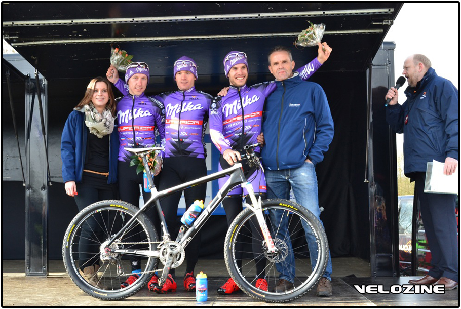 Toonden we 3 weken terug nog beelden van het trainingskamp van Bart Brentjens en de zijne, bleek in Assen dat dat ze geen windeieren heeft gelegd. Het voltallige podium was gekleurd in de Milka Superior MTB Racing Team kleuren. Wie zei dat paars niet combineerde met rood en een beetje wit en zwart? Jeroen Boelen ging met de overwinning aan de haal, met in zijn zog zijn Poolse teamgenoot Marek Konwa en de eind vorig seizoen gerecruteerde Hans Becking.