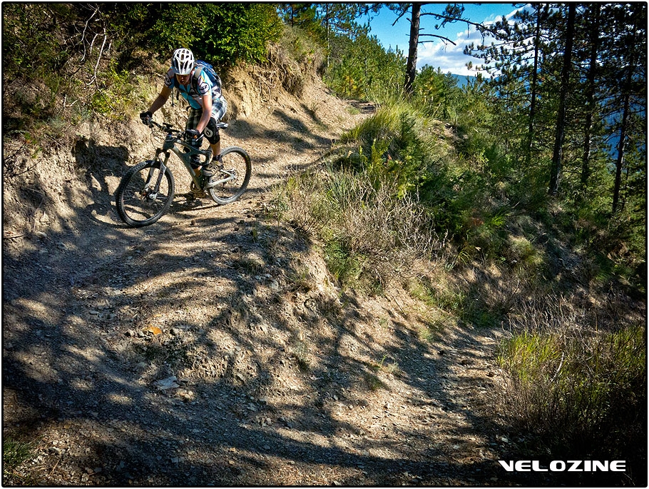 Met de IGN kaart in de hand speuren we naar singletracks, met uitgepijlde wandel- en fietsroute’s (die grotendeels overlappen) als leidraad. Een paar jaar terug vond ik nabij Chatillon prachtig aangelegde paden die ieder putje en iedere vouw in het oppervlak van de heuvels perfect volgde, met een ‘natuurlijke’ flow die smaakte naar meer. Helaas speelden tijd- en techniekgebrek me toen parten. Ditmaal beginnen we onze zoektocht naar droompaden bij de Col de Justin, de eerste heuvel- c.q. bergrug direct ten zuiden van Die. De grindweg naar boven laat ons achter bij een weelde van singletracks, richting Barsac, het plateautje van Grand en Petit Justin, en terug richting de stad. Inderdaad: met wat meer ervaring komen we een heel stuk verder, driften door het bovenste laagje grind, springend over de geulen en ramps gecreëerd door incidentele erosie tijdens heftige regenval. Nu blijkt ook dat je te snel kan: de bochten zijn soms wel erg krap, en de dennenappeltjes blijven eigenlijk nooit liggen.