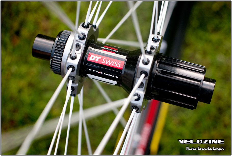 De keuze voor het merk DT Swiss komt voort uit mijn interesse voor hun systeemwielen. Traditioneel is DT Swiss namelijk heel lang gebleven bij het aloude gebogen spaakkop principe, waarmee naven met een standaard flens in standaard velgen gespannen werden. Deze Tricon wielen maken gebruik van rechte spaken en die aan een kant met een nippel in een rim insert bevestigd worden en aan de andere kant aan de naaf vastzitten op een soort ster met 5 punten die los van de naafbody waarin de lagers draaien zit.. Resultaat is in ieder geval twee zwarte wielen met 30 witte spaken per wiel. Naast dit Tricon concept heeft DT Swiss ook nog het Spline concept en het onlangs gepresenteerde Spline One concept.