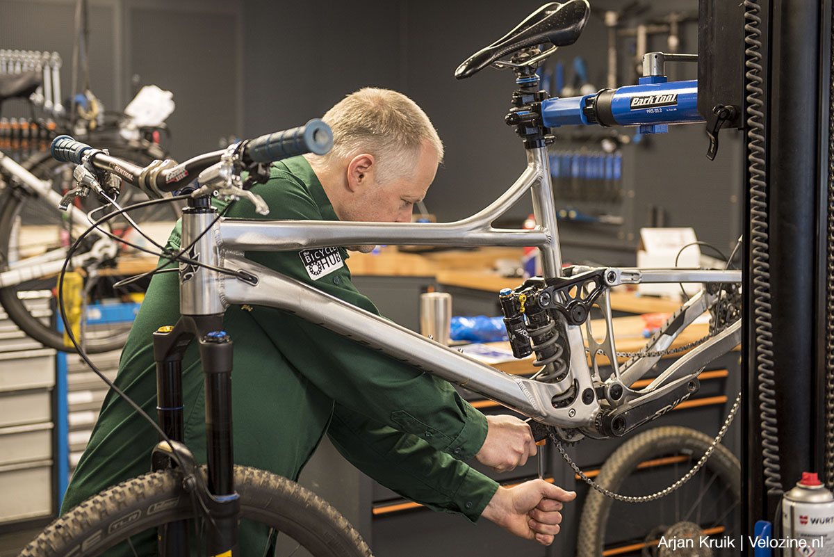 In Wijchen, een dorp iets ten westen van Nijmegen, zit op een doorsnee industrieterrein The Bicycle Hub. In een pand als zovelen; nietszeggend en eigenlijk ook weinig uitnodigend. Maar zoals een kaft niets hoeft te zeggen over de inhoud van een boek, zo zegt de blauwe, stalen wandbekleding aan de buitenkant niets over wat er aan de binnenkant gebeurt. Achter de voordeur ligt de showroom. Het is een ruim opgezette toonzaal, waar de sfeer al meteen schril afsteekt met het anonieme, het industriële buiten. De netjes opgestelde fietsen geven in eerste instantie de indruk dat we ‘gewoon’ in een fietsenwinkel zijn. Maar nog voor die gedachte afgerond is, kantelt dat beeld al. Want wie verder kijkt, ziet dat er in dit pand maar weinig standaard is. De producten, de mensen, de visie en… de klanten.