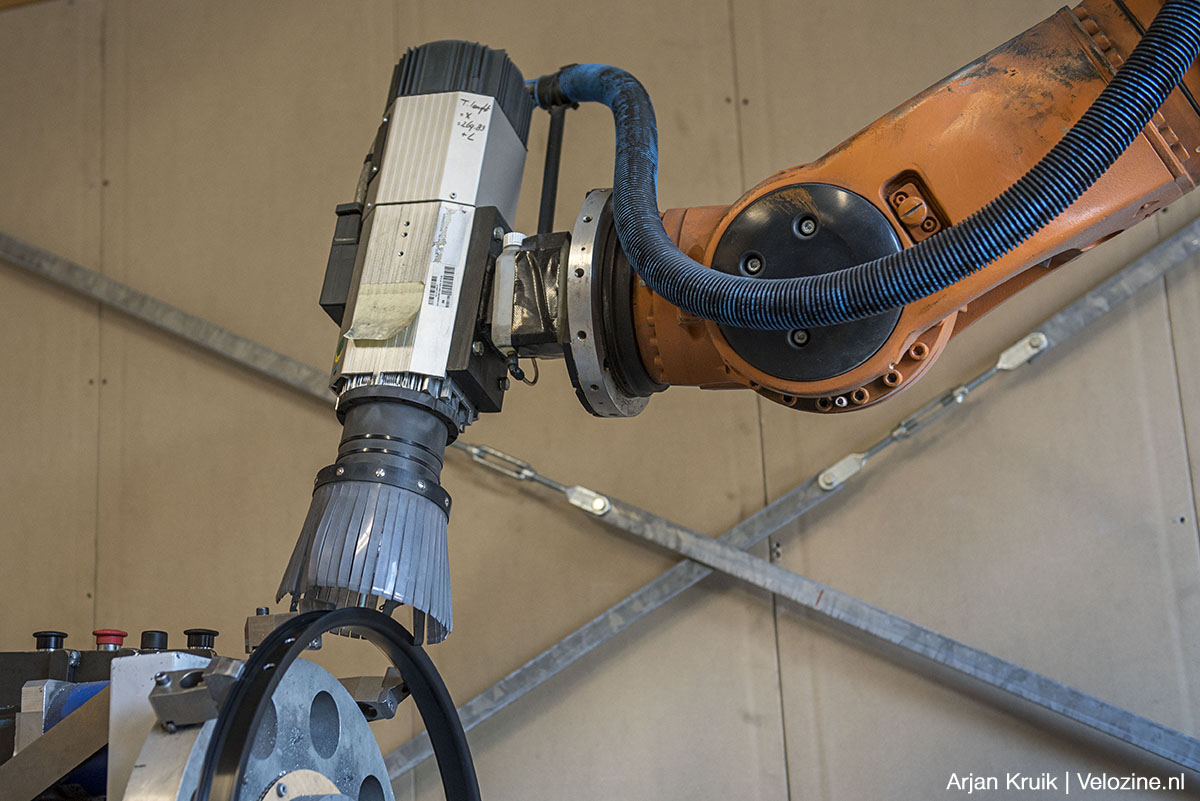 Dat dit niet de enige ruimte is met een indrukwekkend machinepark, blijkt wanneer we verder lopen naar de afdeling van Rotas. Hier maakt Lars z’n aluminium velgen. Na het buigen van geëxtrudeerde aluminium profielen tot ronde velgen, boort een robotarm volautomatisch de spaakgaten onder precies de juiste hoek. Het stelt hem in staat om flexibel te zijn en klantspecifieke velgen te maken, zoals geen enkele andere aanbieder dat kan.