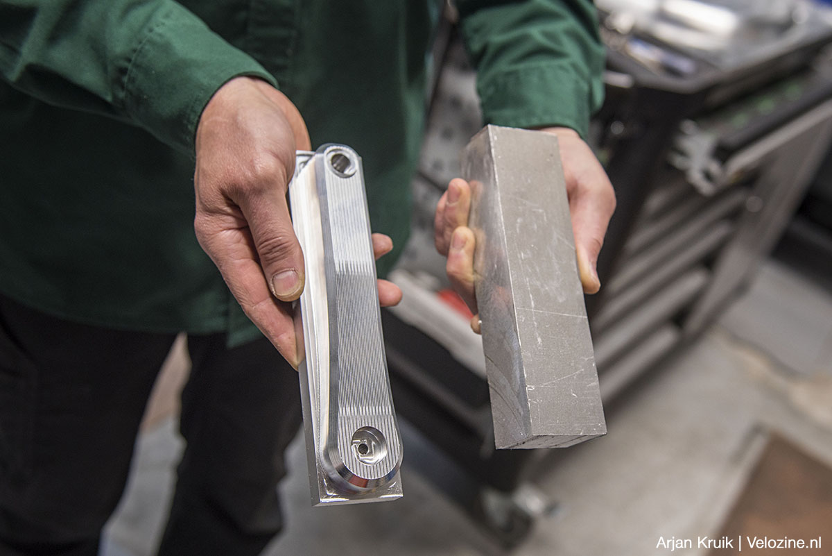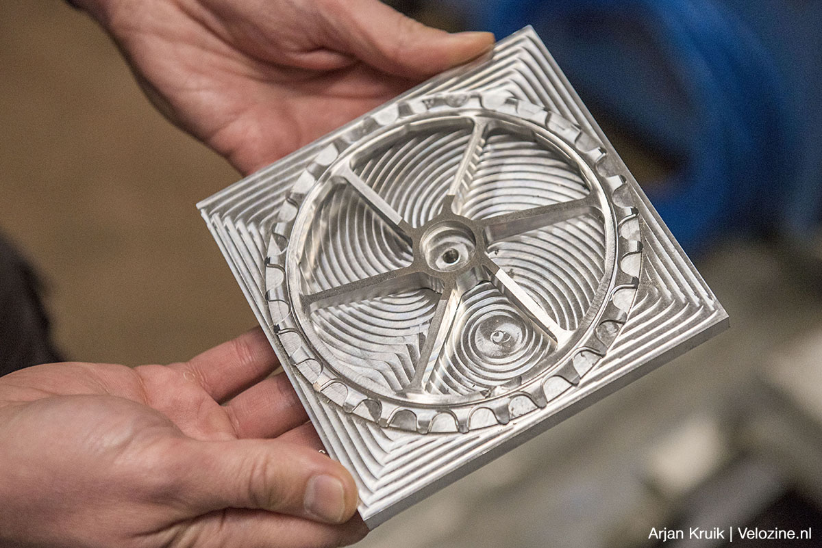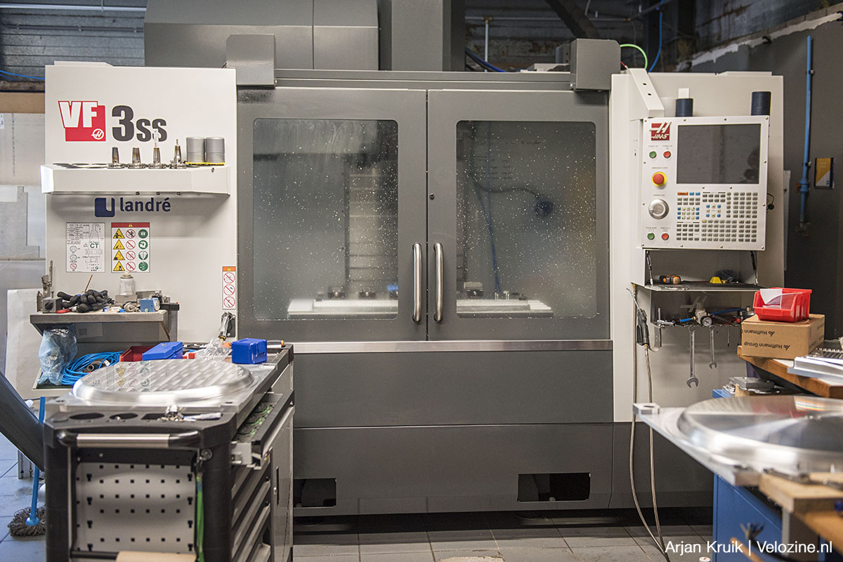 In de ruimte iets verderop klinkt gezoem. Er staat een arsenaal aan frees- en draaibanken, kolomboren en andere machines die elke techneut doen watertanden. Het pronkstuk is de Haas CNC-freesbank. Als er namelijk geen standaardoplossingen zijn, dan maken ze die hier gewoon zelf. Van mallen voor carbon wielen en kettingbladen tot specifieke derailleurwieltjes, complete cranksets en framedelen: “zelf doen” zit hier diep in het DNA. En de drempel om het zelf te maken is hier dan ook bijzonder laag…