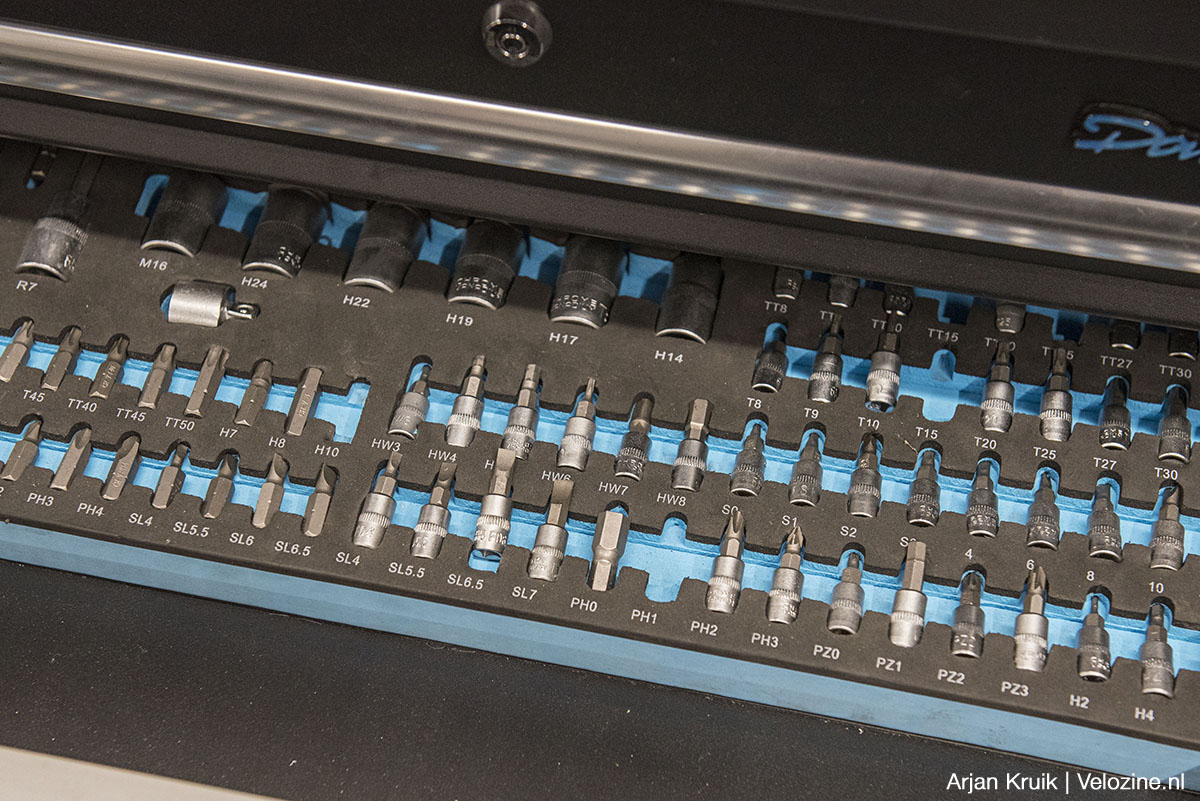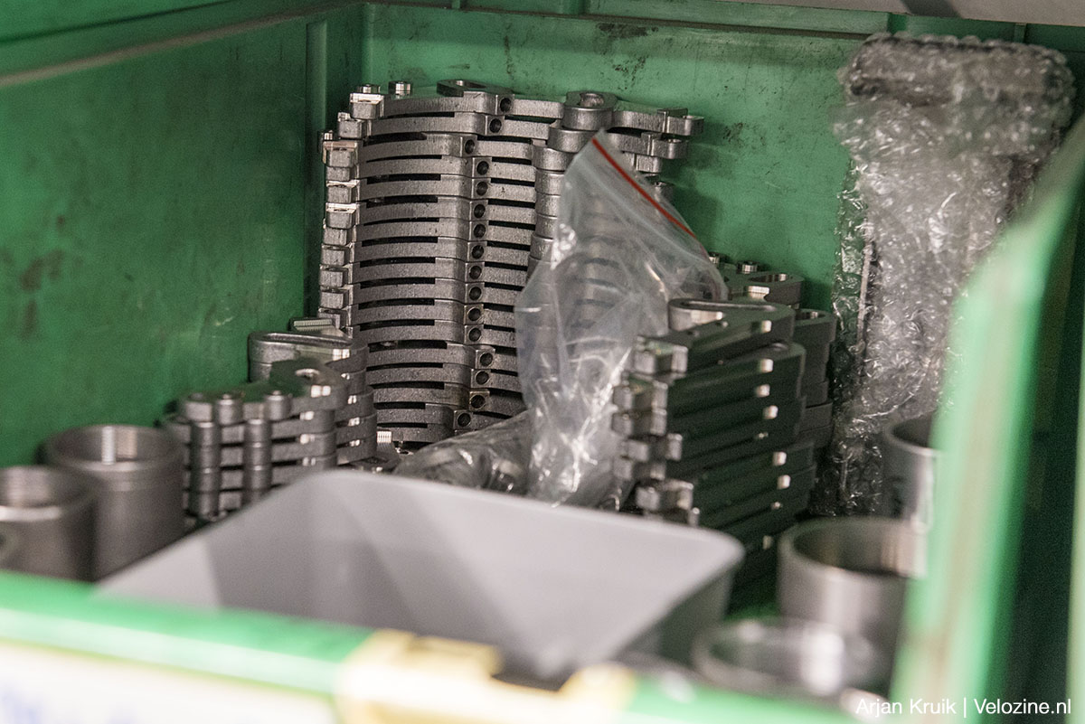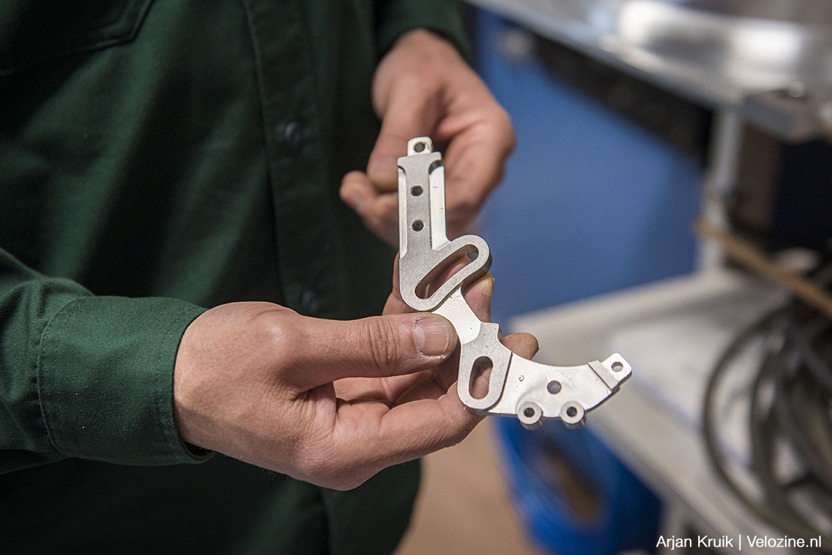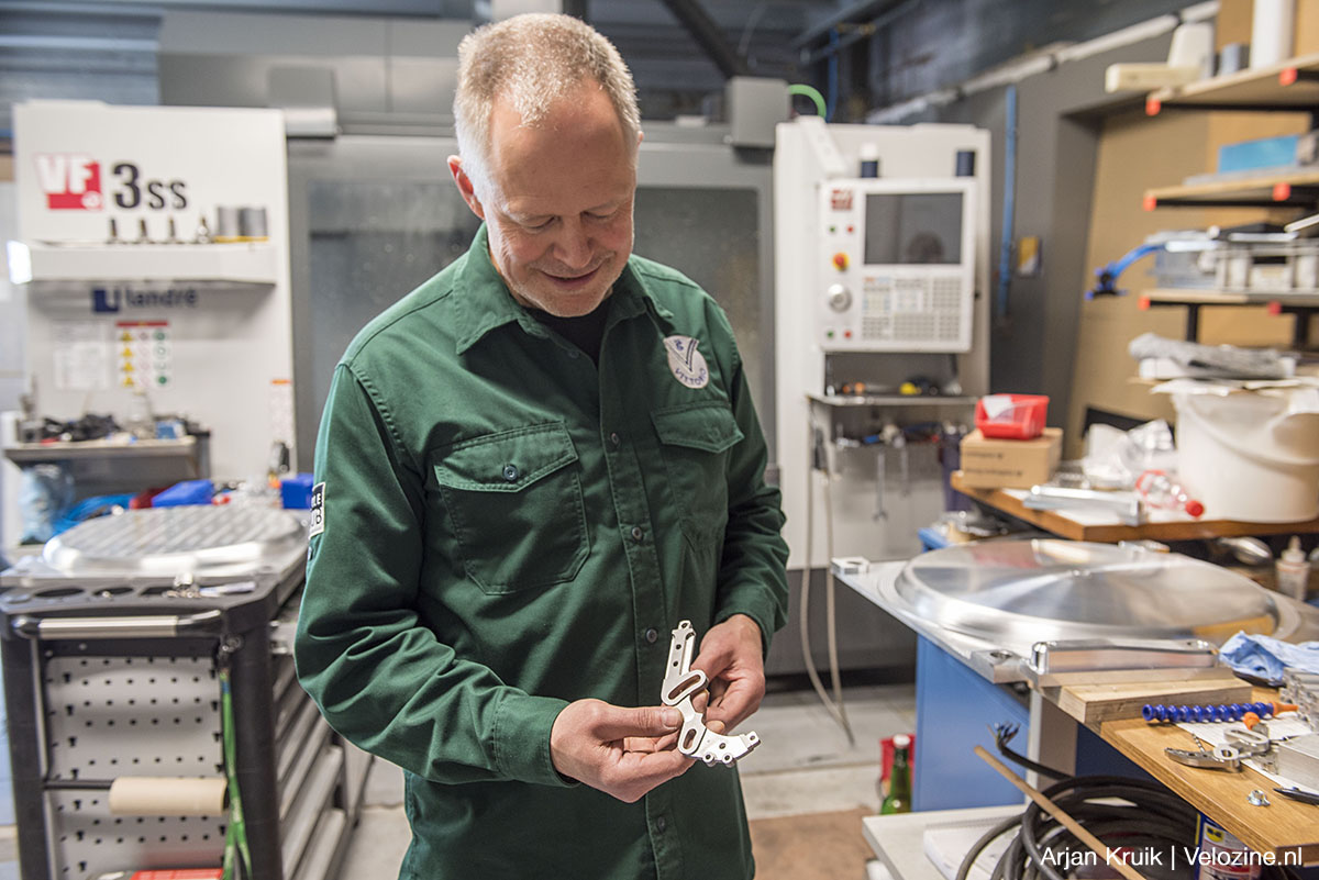 In de ruimte iets verderop klinkt gezoem. Er staat een arsenaal aan frees- en draaibanken, kolomboren en andere machines die elke techneut doen watertanden. Het pronkstuk is de Haas CNC-freesbank. Als er namelijk geen standaardoplossingen zijn, dan maken ze die hier gewoon zelf. Van mallen voor carbon wielen en kettingbladen tot specifieke derailleurwieltjes, complete cranksets en framedelen: “zelf doen” zit hier diep in het DNA. En de drempel om het zelf te maken is hier dan ook bijzonder laag…