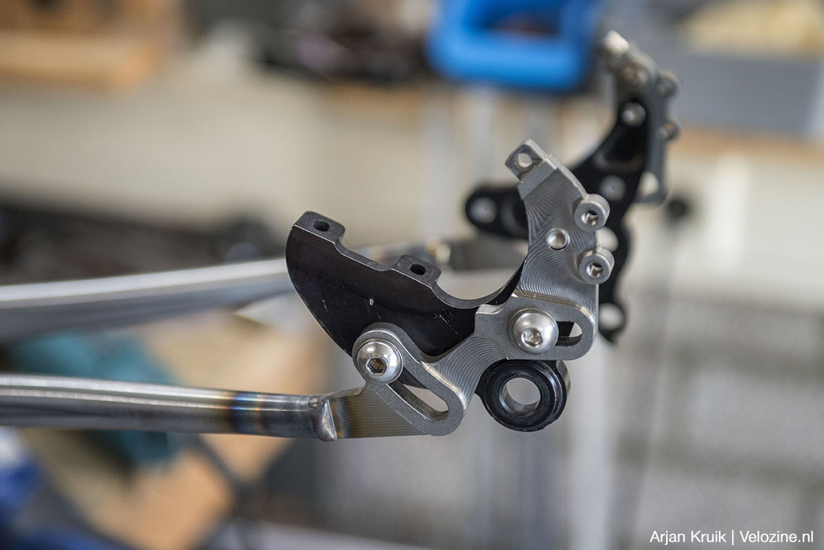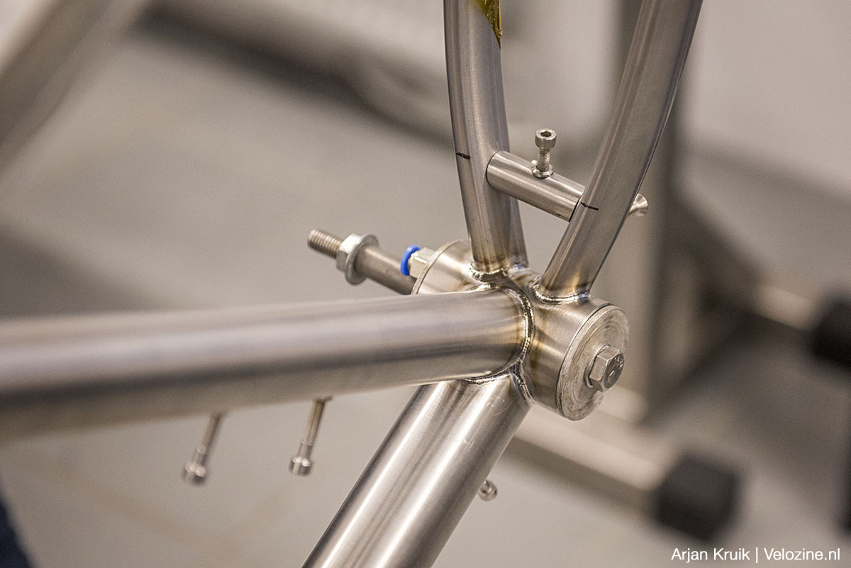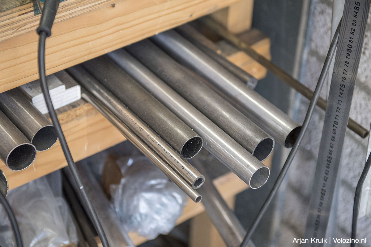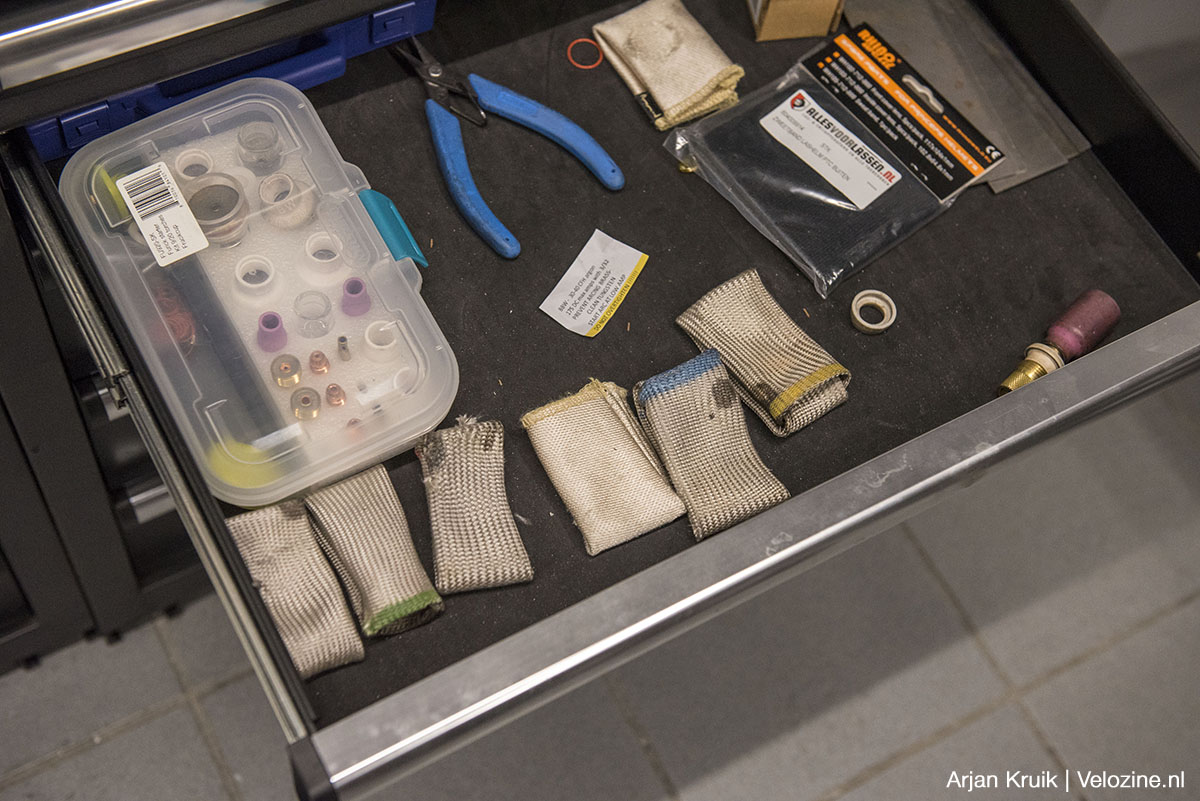 Achterin het pand komen we in het domein van Michiel Burgerhout. Hier komen zijn stalen creaties tot leven. Hij is bedreven in hardsolderen en legt zich sinds kort ook toe op het TIG-lassen. De combinatie van beide verbindingsmethoden geeft hem veel vrijheid. En dankzij het machinepark twee deuren terug, hoeft hij zelden naar buiten te kijken voor oplossingen. Zo ontwikkelde hij bijvoorbeeld de verstelbare uitvaleinden voor de Vittorio’s met naafversnelling of versnellingsbak. De standaardoplossing werkte goed, maar het kon beter. En dus werd het beter gemaakt.