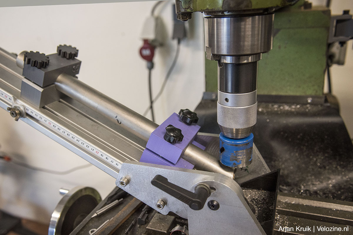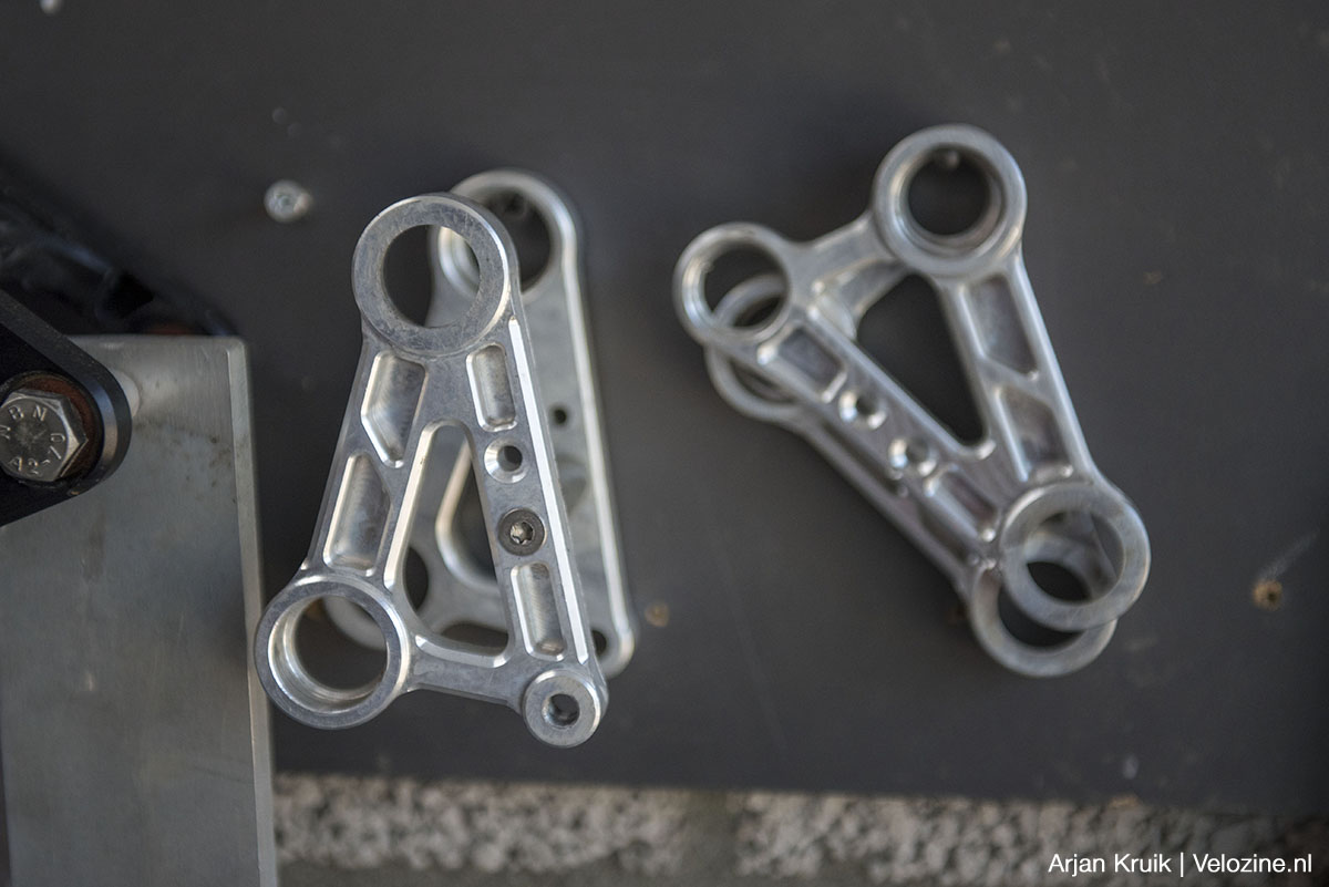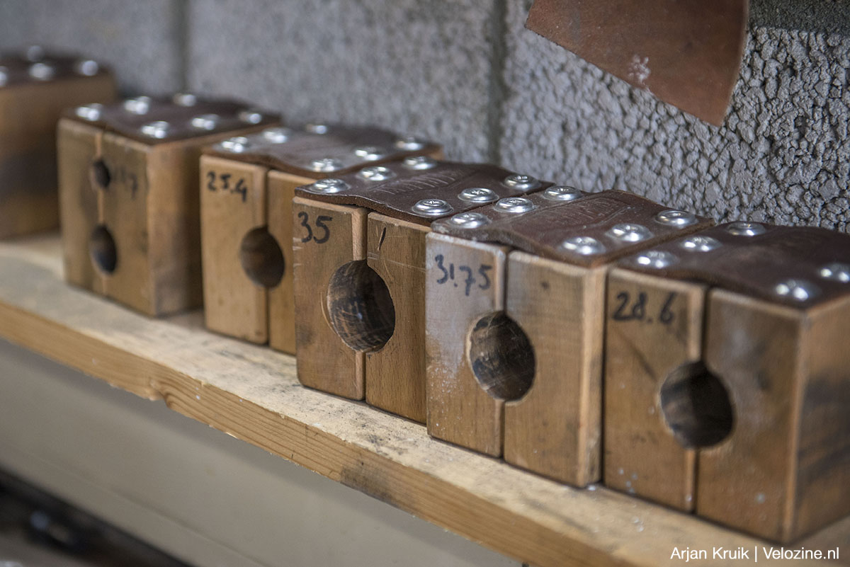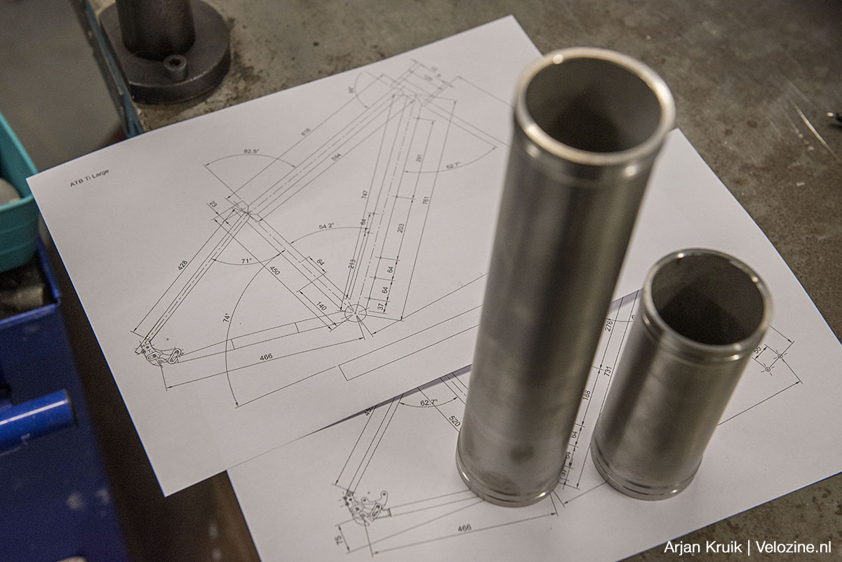 Achterin het pand komen we in het domein van Michiel Burgerhout. Hier komen zijn stalen creaties tot leven. Hij is bedreven in hardsolderen en legt zich sinds kort ook toe op het TIG-lassen. De combinatie van beide verbindingsmethoden geeft hem veel vrijheid. En dankzij het machinepark twee deuren terug, hoeft hij zelden naar buiten te kijken voor oplossingen. Zo ontwikkelde hij bijvoorbeeld de verstelbare uitvaleinden voor de Vittorio’s met naafversnelling of versnellingsbak. De standaardoplossing werkte goed, maar het kon beter. En dus werd het beter gemaakt.