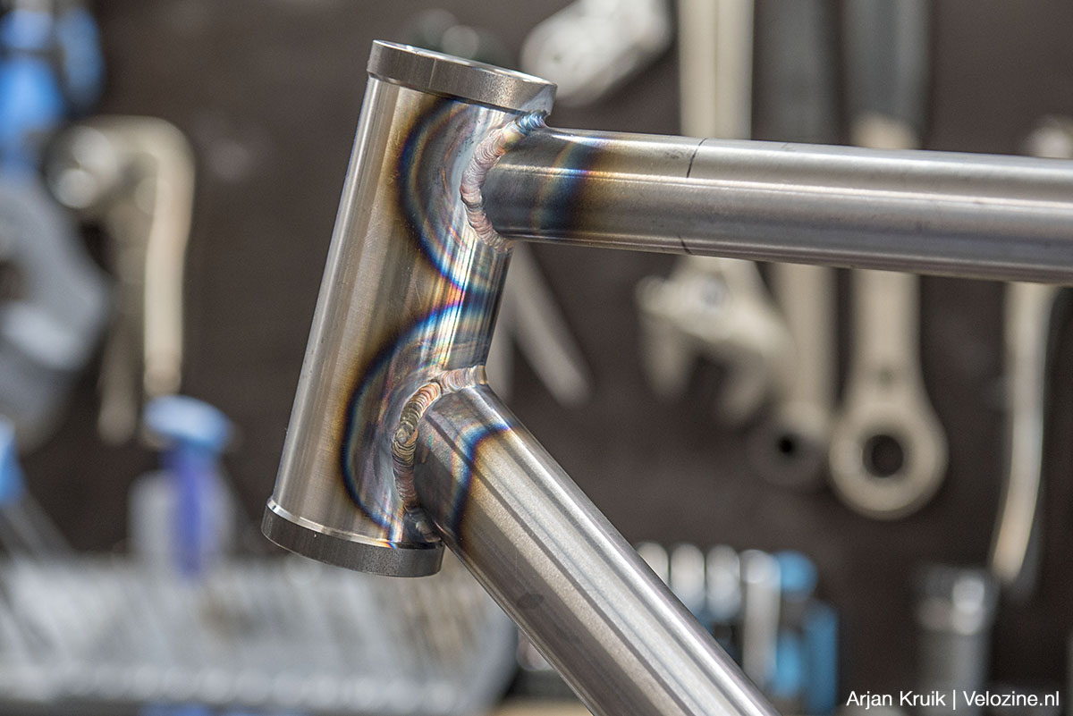En staal is allang niet meer het enige materiaal in huis. Toen Lars het Noord-Hollandse 11Ants overnam, kreeg het collectief er ook titanium bij. 11 Ants, opgezet door drie eveneens kneiterfanatieke bikers, ontwikkelde eigenzinnige frames rond de Pinion-versnellingsbak, met slimme oplossingen zoals excentrische uitvaleinden voor het spannen van de riem. Zij investeerden ook fors in goed gereedschap. Dat is dan ook de reden dat er nu bij The Bicycle Hub onder meer een Process-lasmal van Engin Cycles prijkt; de Bentley onder de lasmallen voor framebouwers. Deze lasmal bevindt zich overigens ook weer in een eigen ruimte. Het werken met titanium vraagt extra immers aandacht ten aanzien van zuiverheid.