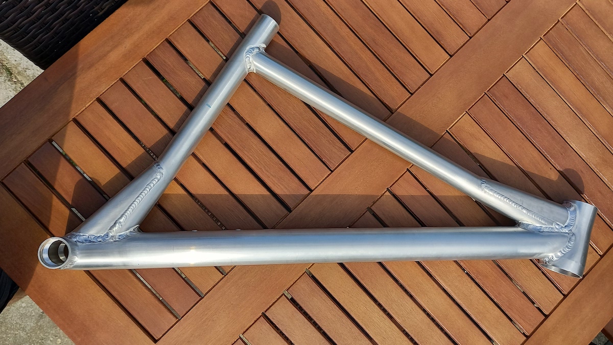 Een mooi detail dat Peter weet te vertellen is dat prototype #2 niet warmtebehandeld is: het ruwe aluminium is luchtgehard. Dat wil zeggen: na een paar maandjes op kamertemperatuur krijgt het metaal dezelfde structuur als wanneer je het frame in een oven op enkele honderden graden zou leggen. Dit is nodig omdat het lassen van aluminium zowel het materiaal verzwakt als allerlei spanningen introduceert. Frappant: ná het uitharden is de uitlijning van het frame binnen één millimeter nauwkeurig. Mening commercieel merk haalt dit niet eens.