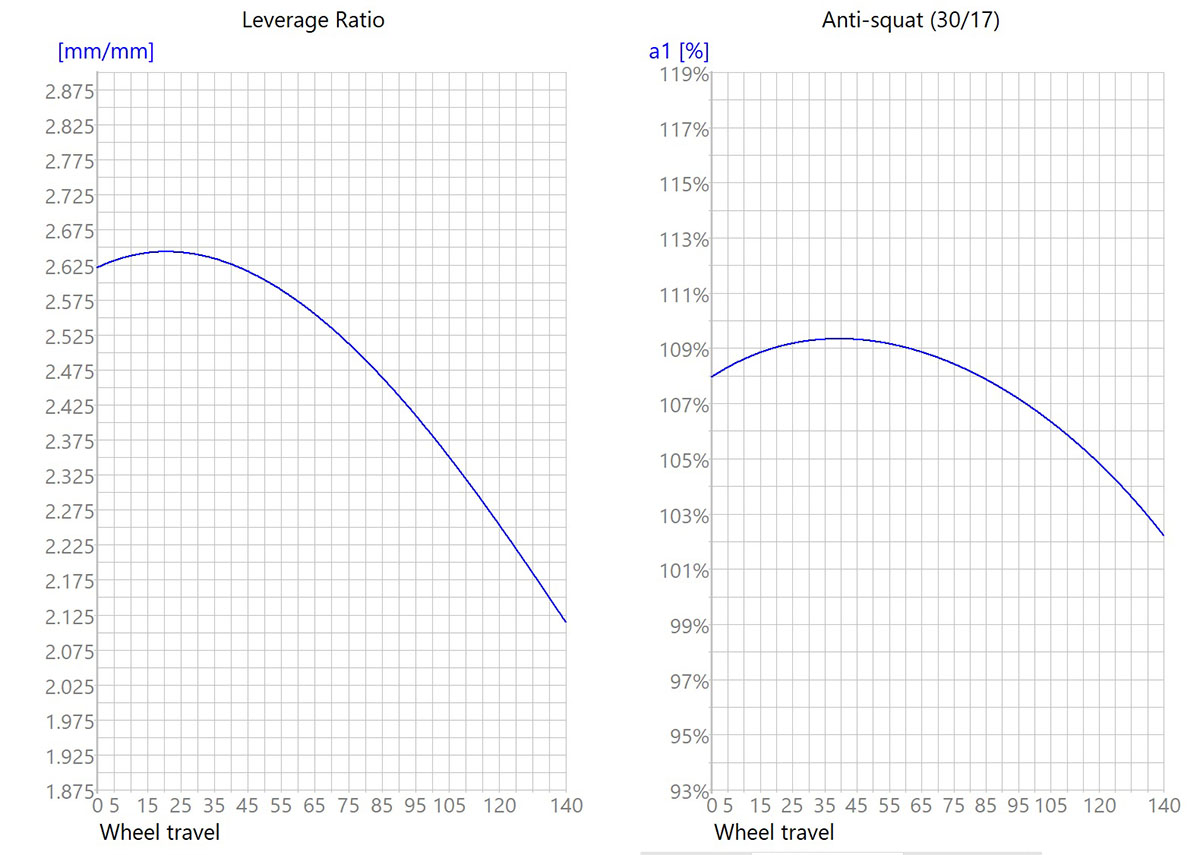 Dat laatste bepaalt zaken als de progressiviteit van de vering. Maar exacte posities van de draaipunten bepalen ook belangrijke waarden als anti-squat en anti-rise. Anti-squat is de mate waarin kettingspanning samendrukken van de (achter)vering door gewichtsverplaatsingen – met name door het versnellen door de berijder – tegengaat. Anti-rise is dan weer de mate waarin het uittrekken van de demper bij (af)remmen wordt tegengegaan. Vervolgens veranderen die waarden ook nog eens met het doorlopen van de veerweg. Een lekker rijdende fiets is daarom – nog los van gebruikte materialen – een optimalisatie van (of beter: een compromis tussen) die eigenschappen over de gehele veerweg!