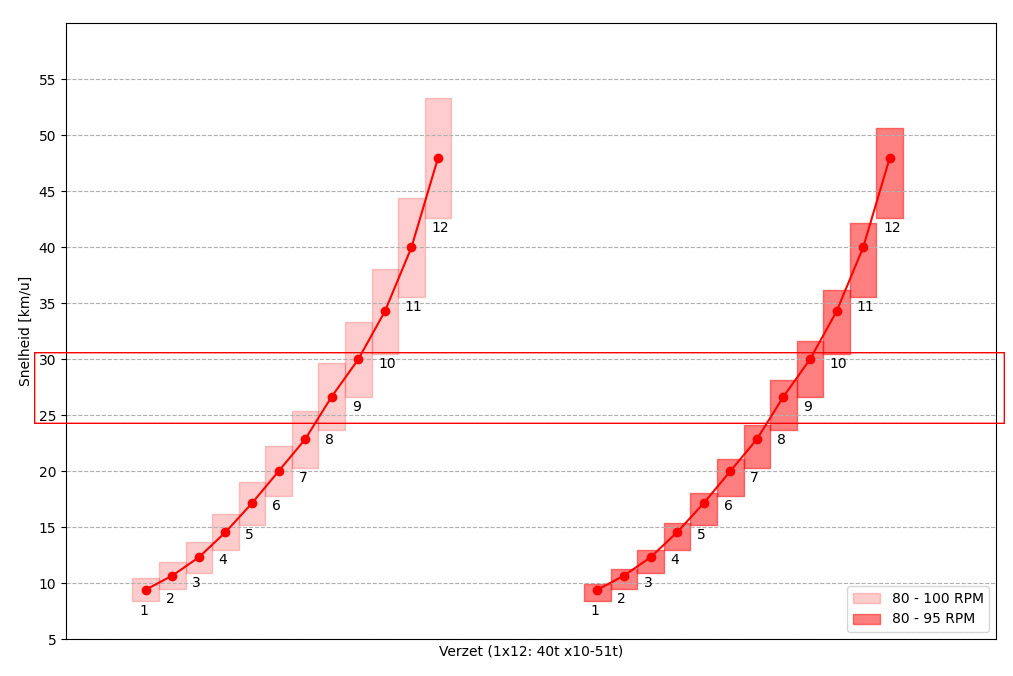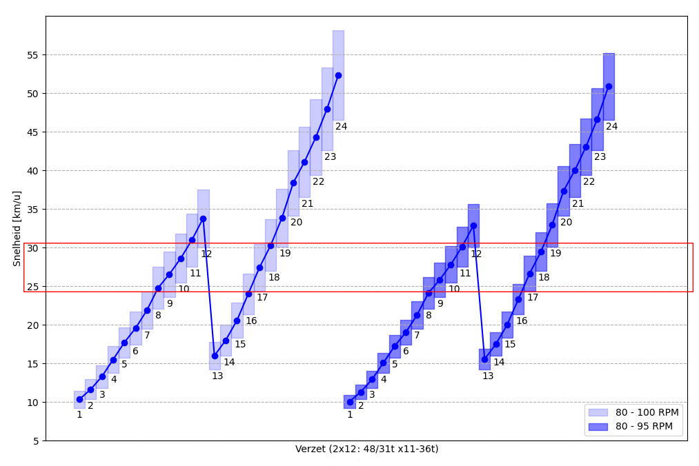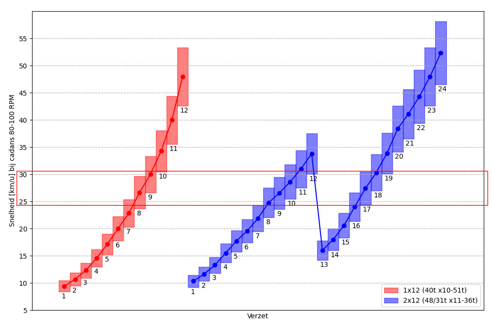 In onderstaande grafiek zie je links in het rood de twaalf verzetten van een 40t x 10/51t aandrijving en in het blauw de vierentwintig verzetten van een 48/31t x 11/36t aandrijving, weggezet tegen rijsnelheid. Bij elk verzet is een kolom weergegeven, voortkomende uit de rijsnelheid bij een onder- en bovengrens van respectievelijk 80 en 100 omwentelingen per minuut. Dit zijn gemiddeld genomen de grenzen waarbij je genegen bent om te schakelen. Zodra je trapcadans richting de 80 zakt, schakel je een verzet lichter. Andersom; wanneer je 100 omwentelingen per minuut trapt, schakel je al snel een verzet zwaarder. Althans… als dat volgende verzet (lichter of zwaarder) je ook werkelijk naar een meer ideale cadans brengt.