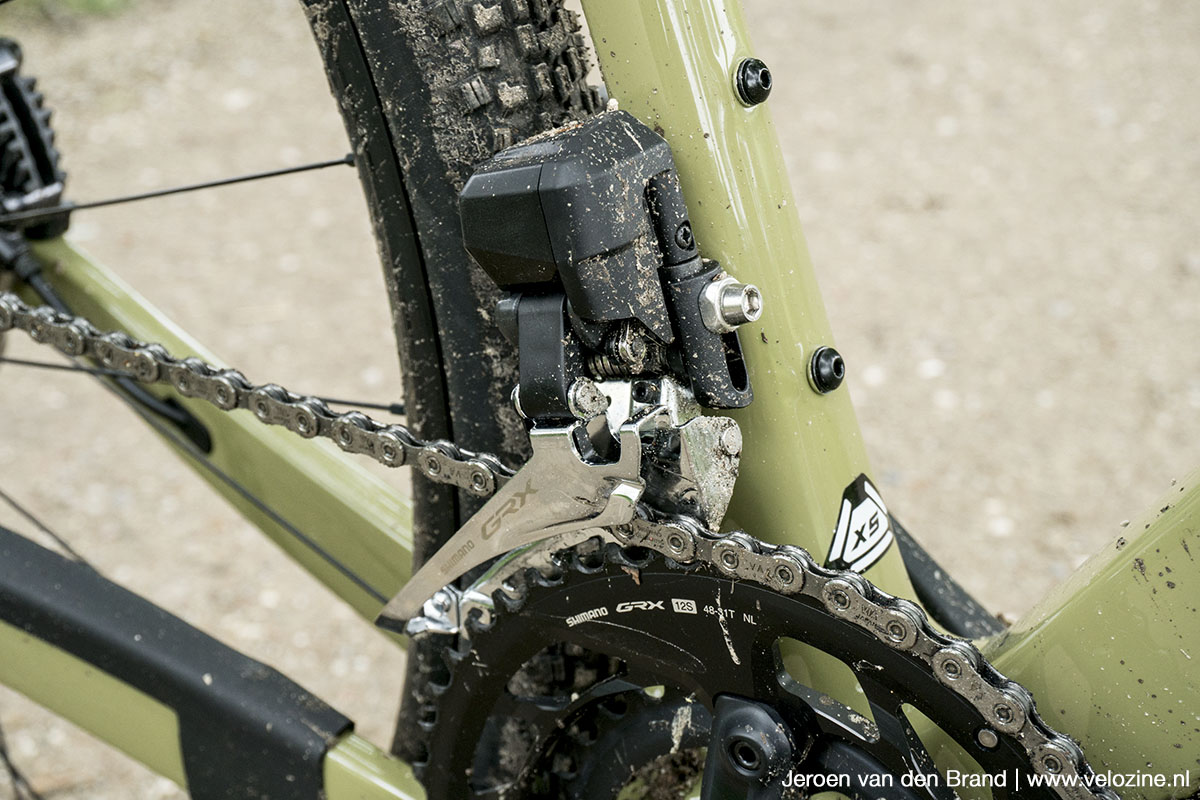 Maar er speelt nog meer. Wat bij gravelbikes hetzelfde is als bij mountainbikes, is dat het voor frame-ontwerpers een lastige taak is om een voorderailleur te combineren met diverse ontwerpwensen bij een frame. Bij mountainbikes gaat dat vooral over ruimte voor de constructie van de achtervering in samenspraak met ruimte voor de achterband. Bij gravelbikes is dit laatste vooral een punt. Het is een flinke uitdaging om een brede band mét twee kettingbladen en een voorderailleur te combineren. En dit vooral zonder dat zo’n brede band de crankarmen en de kettinglijn verder buiten duwt, wat velen als onwenselijk zien.