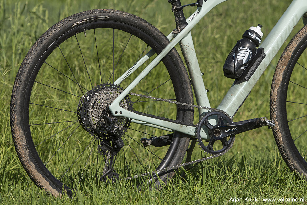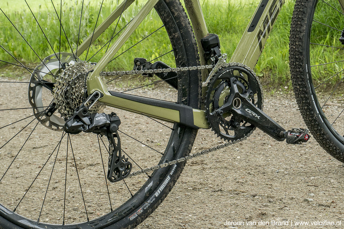 Een in mijn optiek méér steekhoudend argument om een 1x-aandrijving de voorkeur te geven boven een GRX 2x-aandrijving, is de wens om breed mogelijk rubber te kunnen monteren. Met een voorderailleur kan je namelijk niet breder omleggen dan 47 millimeter (afhankelijk van type band en velg). Als je frame breder toelaat, kun je vervolgens met een enkel kettingblad vooraan richting het formaat van mountainbikebanden gaan. En dat is sowieso een trend in wording, als het aan sommige banden- en wielfabrikanten ligt.