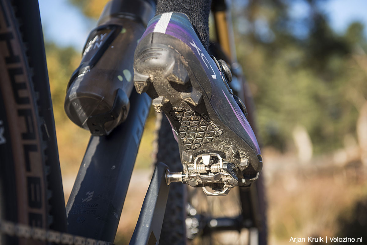 Ik moet de slimme constructie in de zool van de GE7 ook nog even vermelden. De uitsparing die het SPD-mechanisme bij het instappen moet begeleiden, loopt bij de GE7 achter het schoenplaatje gewoon door, helemaal tot onder de voetboog. Omdat het klikmechanisme van het pedaal precies in die uitsparing past, kun je je het midden van je voet op het pedaal plaatsen zónder vast te klikken. In lastige secties van de trail, waar je liever los zit dan vast, kan dat een uitkomst zijn. Alhoewel je de effectiviteit niet moet overschatten; een goed platformpedaal met stalen pinnen biedt oneindig meer grip. Maar goed, het is fijn dat de mogelijkheid er is om niet vastgeklikt toch verder te kunnen rollen. Dat moet je bij de XC7-schoenen namelijk niet proberen…
