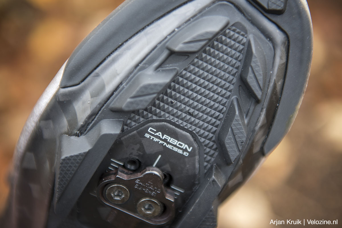 Voor efficiënt trappen wil je een stijve schoen, om lekker te lopen wil je ‘m juist wat soepeler hebben. Bij de GE-modellen heeft de stijfste schoen, de GE 9, een stijfheidsindex van 7, de door ons gereden GE7 staat op 6. Je merkt en ziet het verschil direct waar de carbon zool van de XC7 zich in het geheel niet of nauwelijks laat vervormen, daar laat de vezelversterkte nylon zool van de GE7 wél buiging zien. Opvallend: die buiging zit vooral bij de voorvoet, de sectie onder de voetboog vervormt veel minder.