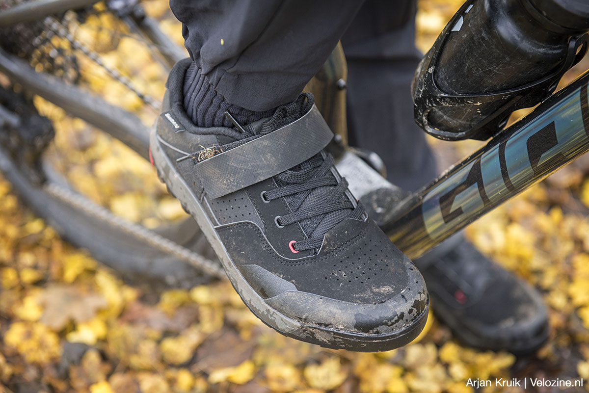 Voor trail en enduro zijn de Shimano GE7-schoenen met de XT Enduro M8120-pedalen onze favoriet. De GE7 weet dankzij een stijve middensectie en soepelere voorvoet efficiënt trappen te combineren met goed lopen. De kooi van het speciale XT Enduro M8120-pedaal voegt helaas weinig toe – een gewoon XT-SPD-pedaal rijdt praktisch net zo goed –, maar het iets grotere contactoppervlak náást het SPD-mechanisme biedt wel iets meer ondersteuning.