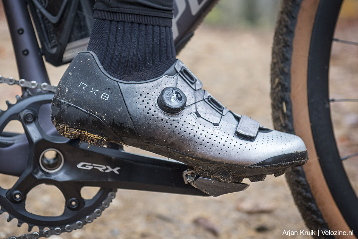 Wie ook onder modderige omstandigheden wil gravelen, gewoon willen kunnen lopen en tegelijkertijd niet wil inleveren op efficiëntie, kan eigenlijk niet om SPD-pedalen heen. En alhoewel stijve mountainbikeschoenen zoals de hierboven beschreven XC7 uitstekend voldoen, heeft Shimano toch gemeend een speciale lijn gravelbikeschoenen neer te moeten zetten. De RX8 is binnen die schoenenlijn het op één na stijfste exemplaar, met een stijfheidswaarde van 10 (op een schaal van 12).