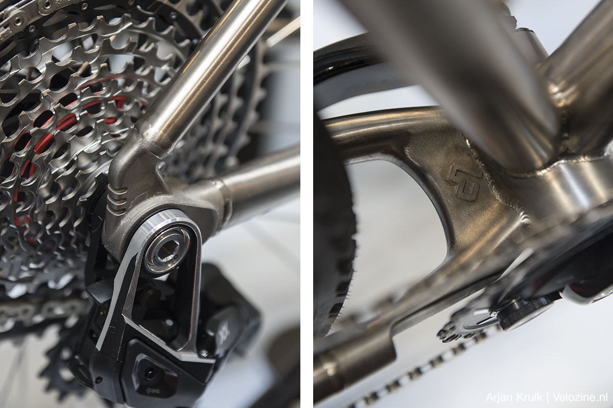 Hierbij zijn delen van de staande en liggende achtervork uitgevoerd als titanium bladveren in plaats van reguliere gelagerde scharnierpunten.