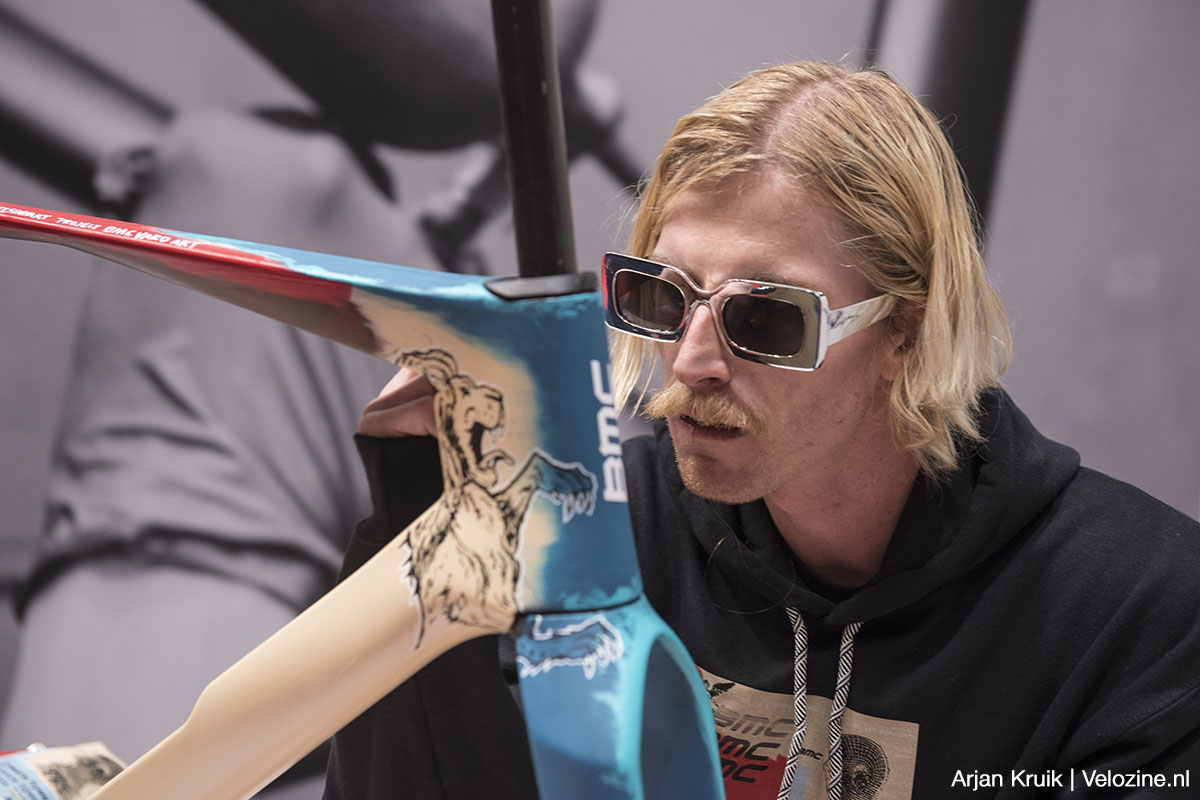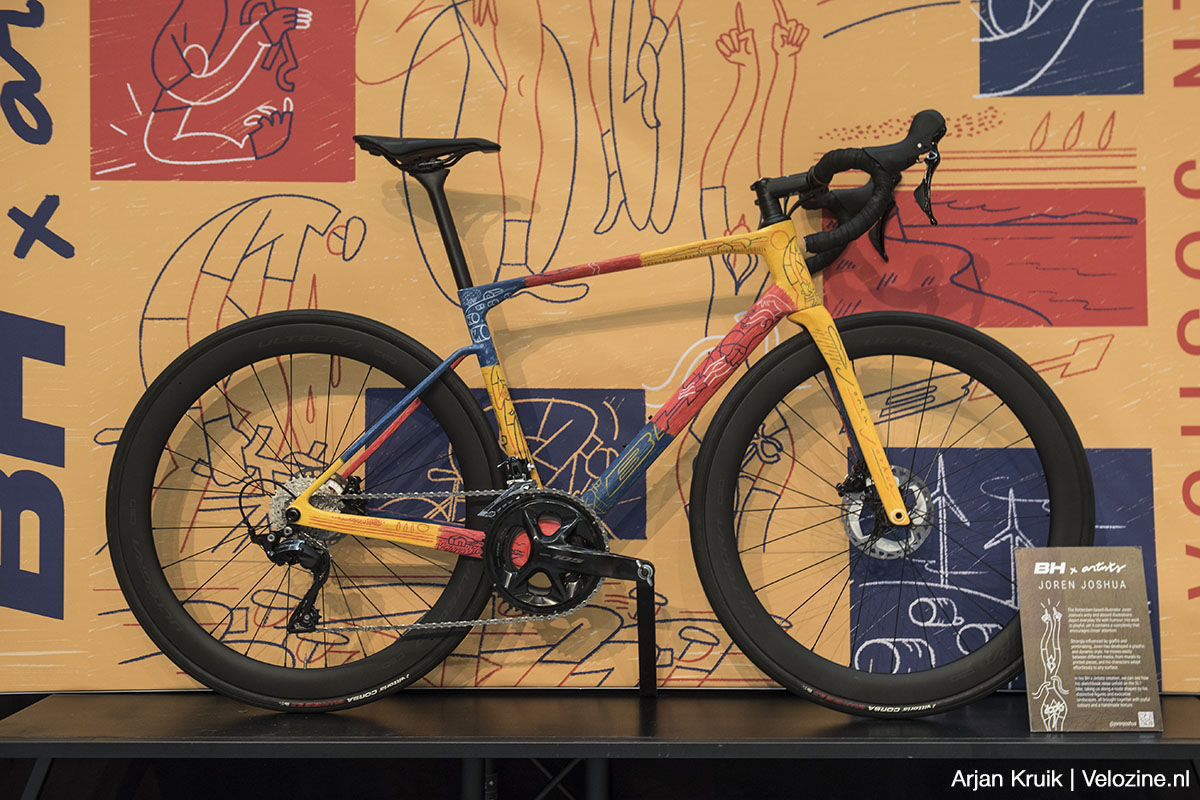 Steevast ingrediënt van een beurs: fietsen als kunstwerken. Sommigen al af, zoals deze BH racefiets met daarop werk van