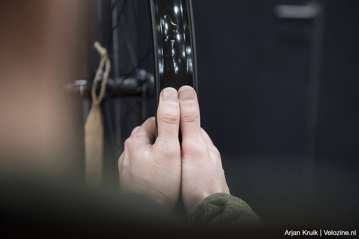 Bij het Nederlandse 9th Wave troffen we dit prototype carbon wiel voor 32 inch banden. Uw hoofdredacteur (1.67 m) voor schaal.