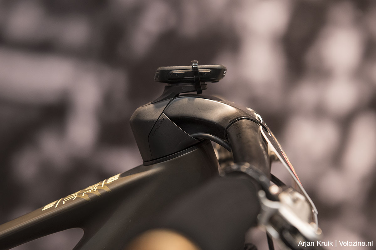 mountainbike hardtail Dogma XC met een aero-cockpit. En ja, de kleine man was geschokt. Of dat kwam door het concept, de uitvoering, of beide, hebben we niet kunnen achterhalen.