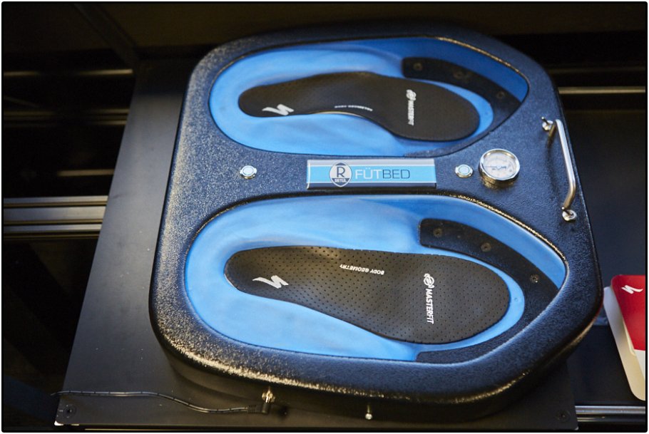 De tweede verassing volgt bij het zadel. Ik ga zitten op een enorme touchpad. Die meet de afstand tussen de zitbotten en adviseert een zadelbreedte. 143 mm, flink breder dan mijn eigen Fi’zi:k’s. Peter Kraaijvanger, Specialized: “Het is onze ervaring dat alleen mensen die extreem diep zitten (en dus op de voorzijde van de zitbotten, niet op de punten) zulke smalle zadels gebruiken. Zó diep zit je niet, vandaar de 143.