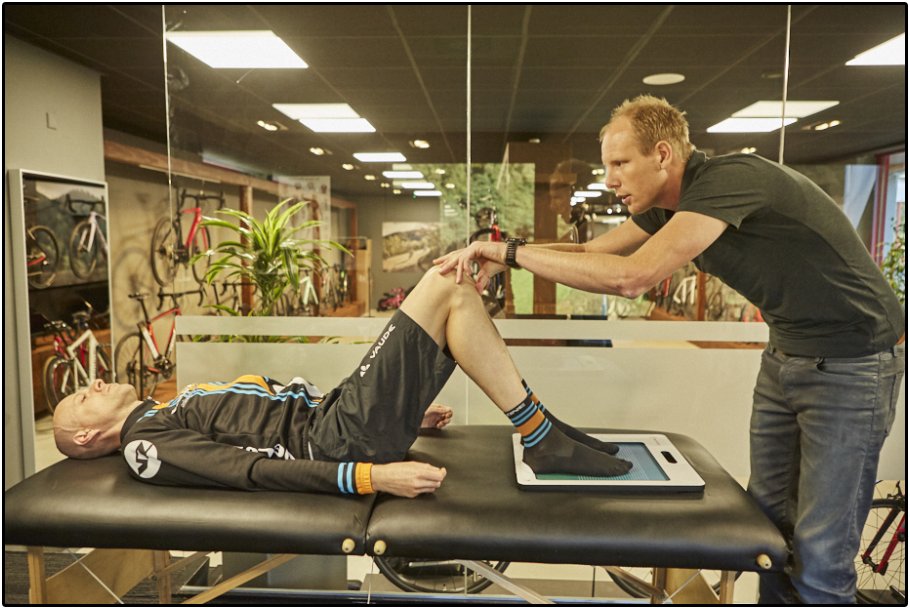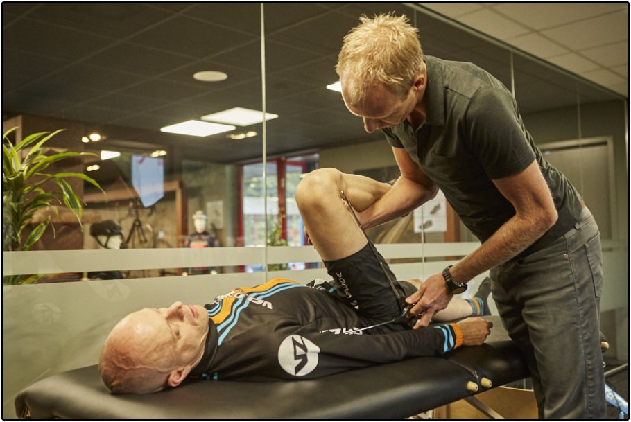 Mocht hier je meetlinten verwachten, dan heb je het mis. Het gaat hier om hoeken, stabiliteit, flexibiliteit en symmetrie. Hoe ver draait je heup? Heb je beenlengteverschil? Hoe stabiel is je romp? Kun je één been, door je knie zakken? Enzovoorts. In een half uur leert de fitter hoe jouw bewegingsapparaat in elkaar zit, waar dat invloed kan hebben op je fietsplezier, en wat dat betekent voor de afstelling van fiets, en schoenen. Het is het moeilijkste gedeelte van de meting en vraagt kennis en ervaring. Niet iederéén mag hem uitvoeren.