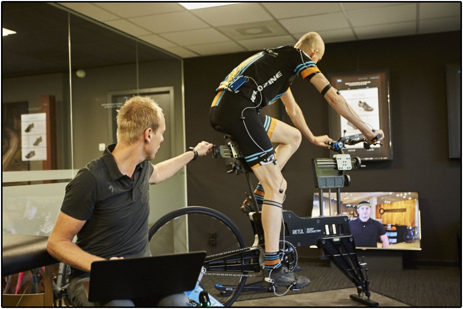 …vraag ik me ondertussen al even af. De Müve staat immers al anderhalf uur naar me te lonken. Maar nee, eerst moet ik nog bedraad worden. Want: Body Geometry Fit beoordeelt je fietsbeweging alleen op het oog. Retül voegt daar iets aan toe dat je kent uit de filmindustrie: motion capture. Gelukkig volstaat hier een klein harnasje, en hoef ik dus geen blauw schaatspak aan… Maar nóg zijn we er niet: Peter stelt de pasfiets af op een Specialized Epic XL met en de geadviseerde zadelhoogte. Pas dan mag ik plaatsnemen.