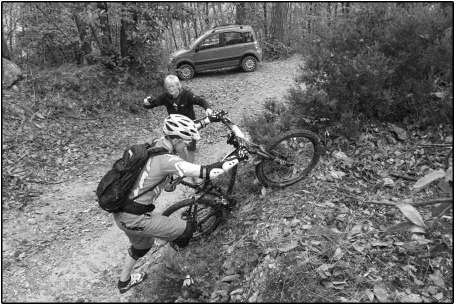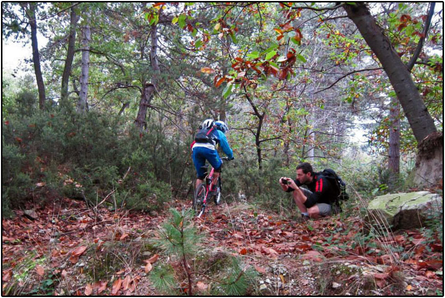 Zelf opteer ik (zeg ik nu makkelijk achteraf, gezien niemand de waarheid ervan kan toetsen) om eens niet het achterwiel de bocht in te laten driften. Komt het achterwiel naast het pad terecht dan is het weer lastig optrekken want inderdaad: de eerstvolgende meters gaan bergop. Ik ram de ketting naar rechts over de cassette en met vier keer trappen gaat het pad al weer dalwaarts, om driftend over bladeren, stenen en wat restanten hout de volgende bochten door te gaan.