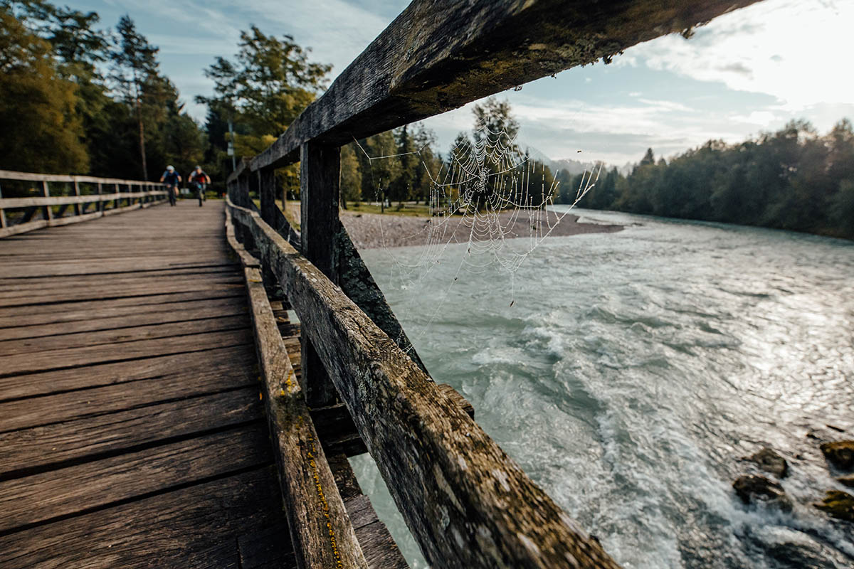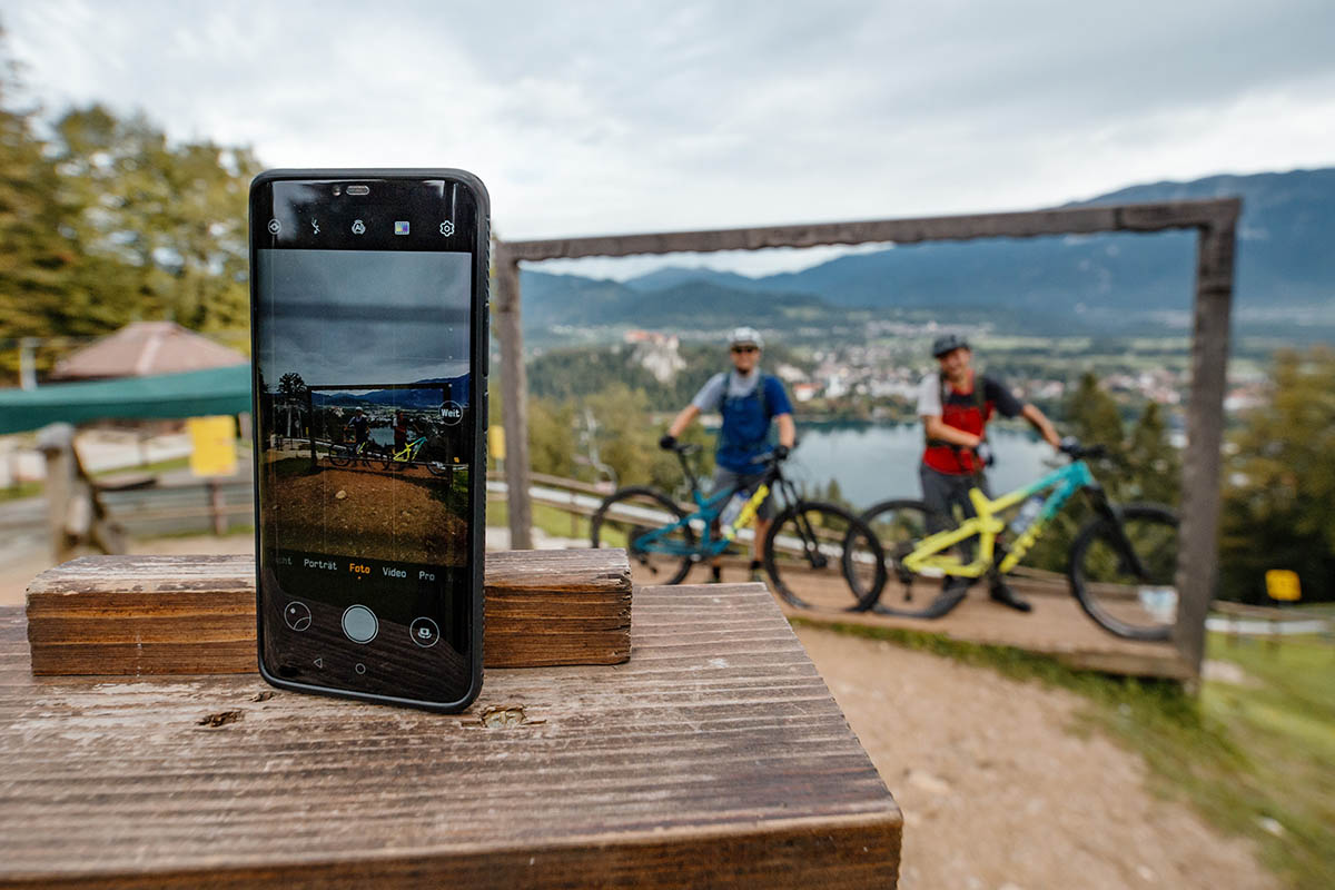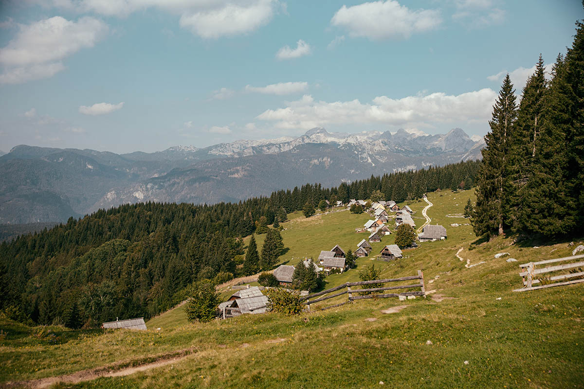 We willen de Julische Alpen en Nationaal Park Triglav van dichtbij meemaken. Bocht na bocht slingeren de lange pasweg het Pokljuka-plateau op, ver boven de vallei. Hier haalt het Sloveense cultuurlandschap weer alles uit de kast. Kleine houten hutjes en kapelletjes zijn keurig verdeeld tussen groene en deels reeds gemaaide weilanden. We genieten even van het uitzicht en gaan dan het bos in. Eerst over boswegen, maar als snel wordt het steeds smaller, steniger en steiler. We draaien de laatste hoogtemeters rond massieve kalkstenen rotsen. Dit is zo steil dat onze gids Lukas zijn ketting kort voor het hoogste punt breekt. Gelukkig zijn we bijna boven. Kan Lukas zijn bike op orde brengen en wij van het uitzicht over het meer van Bohinj.