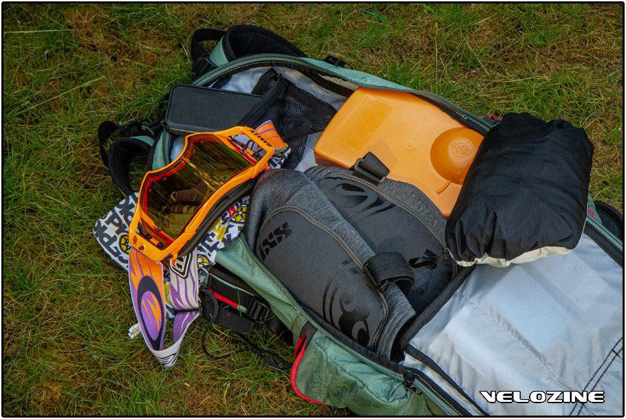De FR Trail kan makkelijk 3 l water mee nemen, hoewel ik dat omwille van het gewicht probeer te vermijden. Verder is de tas grofweg verdeeld in een groot intern compartiment, een gereedschapsvak met allerlei onderverdelingen, en wat externe opbergruimtes. Extern stop ik spullen waar ik snel bij wil: een kaart, camera, stuk eten of een liftpas. Deze tas heeft drie zijvakken waar je makkelijk bij kan: 2 op de heupen en 1 op de buikriem. Gereedschap gaat inderdaad in het gereedschapsvak, en in het grote hoofdvak past onder meer extra kleding. Als je bij -3 graden uit de lift stapt is het soms wel eens handig een échte jas mee te hebben. In de FR Trail past die. Er zijn bovendien riemen om een XC of fullface helm aan te hangen (tijdens dat 3u durend loopstuk) en extra riemen onderaan, buiten de tas, voor opgerolde kleding of knie- en armstukken. De ‘normale’ vulling voor een lange dag in hooggebergte met de enduro bak is dan iets als volgt:
