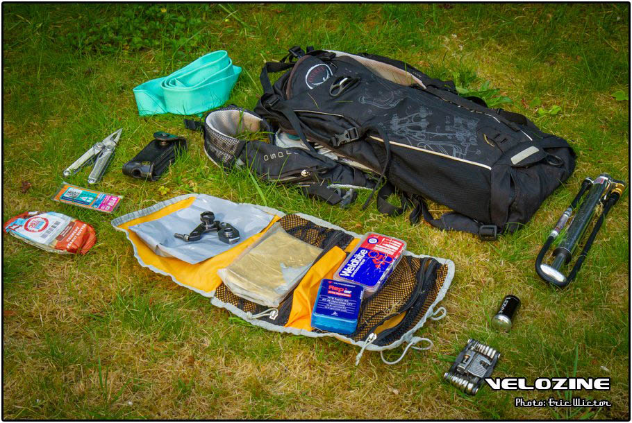 Voor tochten van 1-2 u rondom huis redeneer ik langs soortgelijke lijnen als Coen in het vorige artikel. Ik gebruik daarom sinds een tijdje eigenlijk altijd een Evoc Multiframe tas. Tijdens zulke korte rondjes red ik me makkelijk met 750 ml water of minder, en dát past dan gewoon in een – makkelijk schoon te maken – bidon. In de Multiframe tas zitten dan een minipomp, een reserve reepje (ik moet inderdaad de houdbaarheidsdatum eens controleren…), een Crank Brothers Multi-17 tool, een ID-pasje en een Michelen C4 Latex binnenband. Die C4’s rekken genoeg voor alles van 26″ tot 29″ wielen, dus het hele huishouden aan wielmaten is er in nood mee te reden. Mocht ik er aan denken mijn telefoon mee te nemen dan verdwijnt die in m’n broekzak.