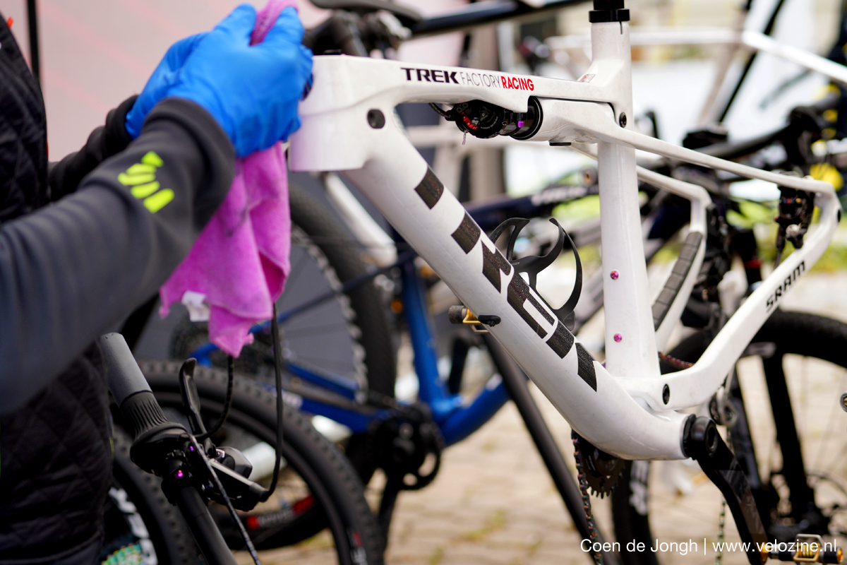 Bijgeloof of aandacht voor details: roze bidonhouderboutjes én een roze poetsdoek. “Je mag ALLEEN met roze doekjes aan mijn fiets komen” schijnt Evie Richards gezegd te hebben… maar misschien heb ik dat gedroomd.
