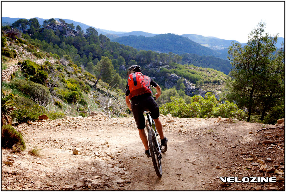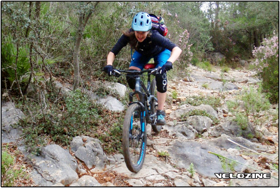 De olijfbomen maken plaats voor laagbegroeiing en rotswanden. Ineens rijden we op een prachtige singletrack. Voor ons zien we – door een zadelkom heen – in de diepte ver weg, de azuurblauwe zee. Wauw! Janine roept: “yeahhhhhh!” De prachtige trails brengen ons, zonder dat onze benen er pijn door ervaren, verder omhoog. Hier en daar raken de harde takken onze schenen en kuiten en laten ondiepe rode wonden achter.