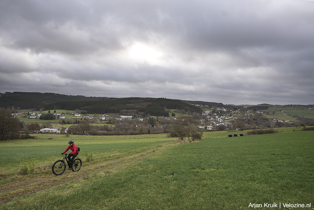 Na deze sigaar uit eigen doos dalen we weer af naar het Ourdal. Vanwaar de route vervolgens – hoe kan het ook anders – weer omhoog gaat. Maar we doen het graag, dat klimmen, vooral omdat deze laatste klim gewoon ook heel erg leuk is. Het pad is smal en loopt langs een steile en rotsachtige heuvelflank, waardoor je je bijna in de Alpen waant. Een leuke finale. Eenmaal boven verruilen we bos voor weiland. In de verte ligt Schönberg, we zijn bijna rond. Om het af te maken begint het ook ineens te regenen. Vlak voor Schönberg heeft de route nog een smal paadje voor ons in petto, maar vanwege de regen slaan we dat even over en rollen we over de weg terug naar de bus. Hi-five, wat een lekkere mountainbikedag!