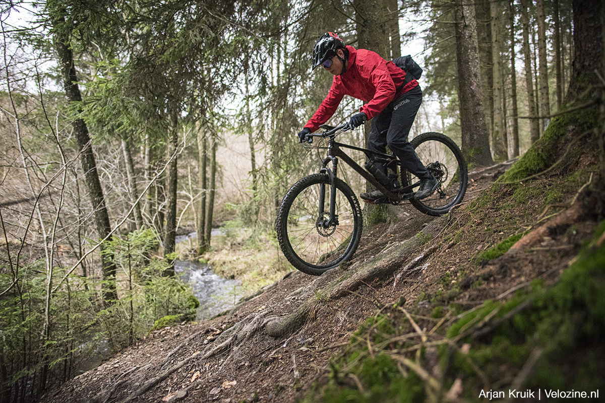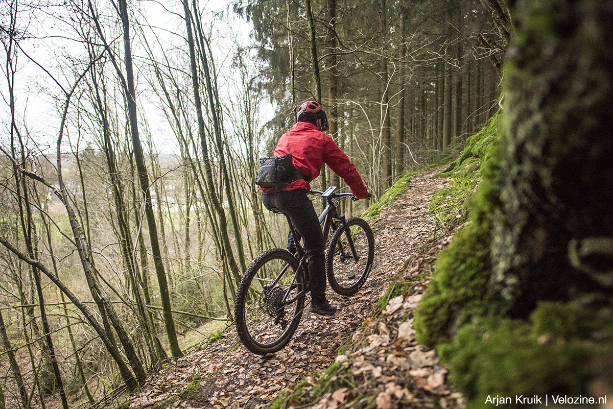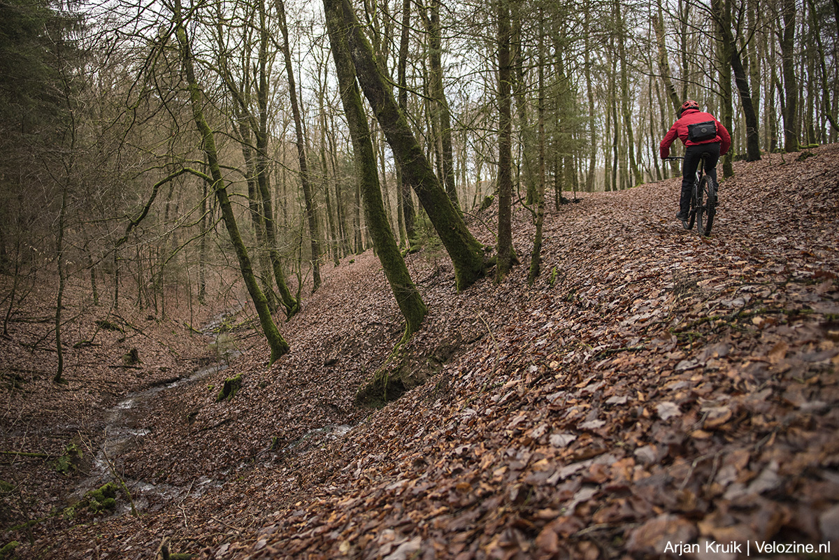 Van even rustig warmrijden is geen sprake, de route gaat gelijk omhoog, meer dan honderd hoogtemeters aan één stuk met een stijgingspercentage van zo nu en dan meer dan tien procent. Pfff! Eenmaal boven glooit de route lekker op en neer, door bossen en velden, over onverharde bos- en veldwegen met korte zo nu en dan korte asfaltsecties. Na een klein zeven kilometer fietsen, bij het plaatsje Herresbach, draait de lus weer richting Schönberg en begint een relaxte singletrack-afdaling die alles bij elkaar ruim vier kilometer lang is! Nou ja, relaxed: sommige secties langs de fraaie Weberbach liggen bezaaid met wortels en daar is het toch echt wel opletten geblazen.